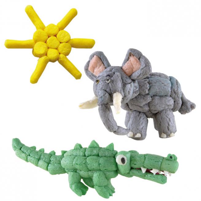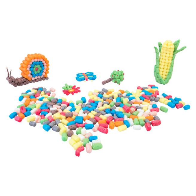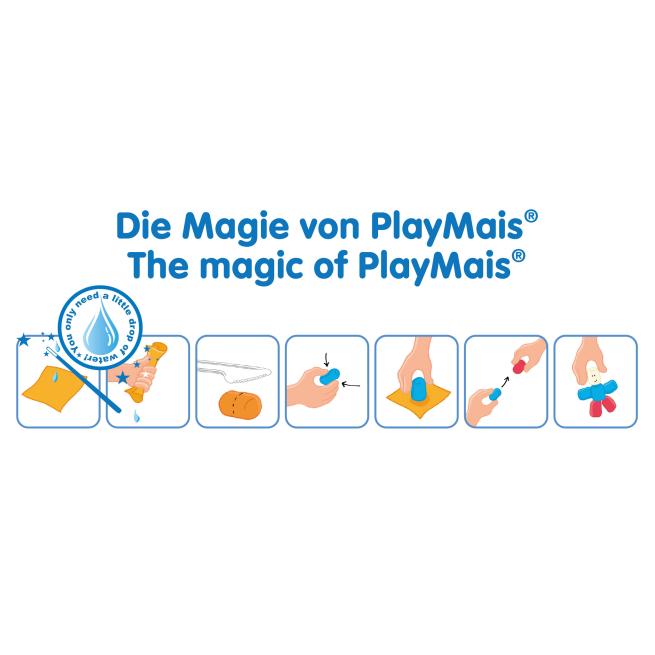 PlayMais® wird auf der Basis von Maisgrieß sowie Wasser hergestellt und mit Lebensmittelfarbe gefärbt. Aufgrund der enthaltenen Stärke haften die einzelnen Sticks mit Wasser aneinander: Einfach leicht anfeuchten und an andere Sticks drücken.