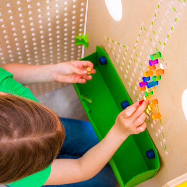 Das Element der Illusion fasziniert Kinder durch seine lebendigen Farben. Kinder haben die Möglichkeit, verschiedene Motive und Bilder zu erstellen. Auf der Rückseite des Activity Hauses ist eine Raketenform farblich hervorgehoben, an der auch erste Rechenmuster entstehen können. Die Acrylstäbe leuchten wunderschön und bunt, sobald Sonnenlicht oder helles Licht darauf fällt. Dies sorgt für eine besondere Lichtstimmung und ist einfach sehr ansprechend.