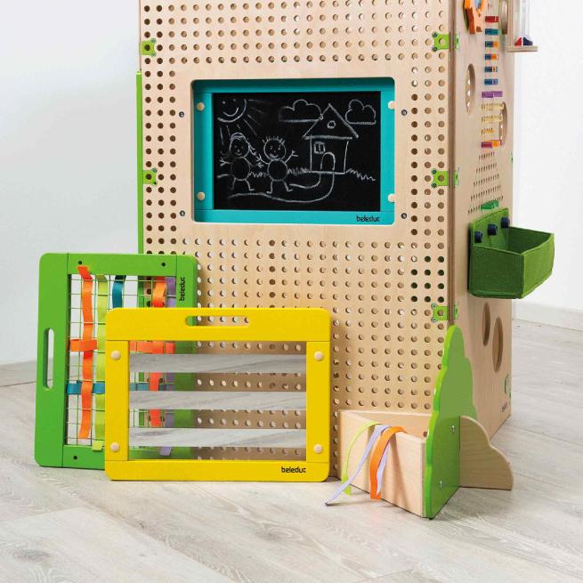 Activity Spielhaus, bestehend aus 4 Grund-Bauteilen inklusive Aufbewahrungsboxen und Montageset1 Kreide- bzw. Magnettafel