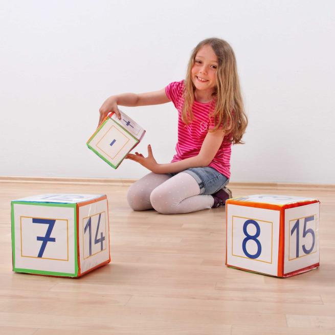 Würfel immer wieder neu gestalten! Die Schaumstoffwürfel sind mit Vinyl überzogen. Auf jeder Fläche befindet sich ein Kunststofffenster, in das Karten eingeschoben werden können. So entstehen Bewegungs-, Buchstaben-, Rechen- oder Erzählwürfel.