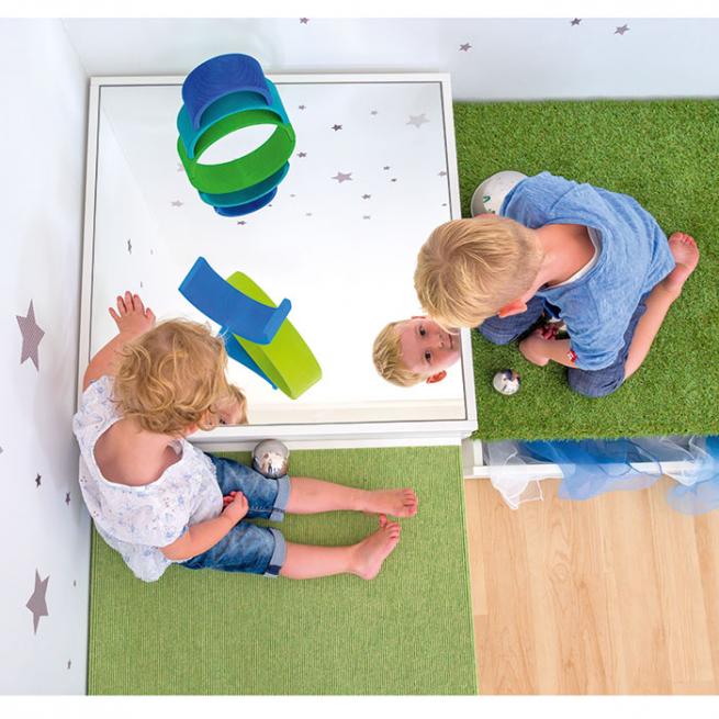 Hinweis: Das Spiegelpodest unterstützt den Forscherdrang Ihrer Kinder und das Erlebnis des Spiegelns anschaulich. Bitte beachten Sie, dass kantige und grobe Materialien den Spiegel zerkratzen können und schwere Gegenstände wie z. B. fallende Holzbauklötze zum Brechen des Spiegels führen können.