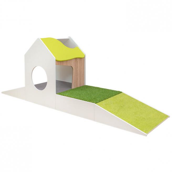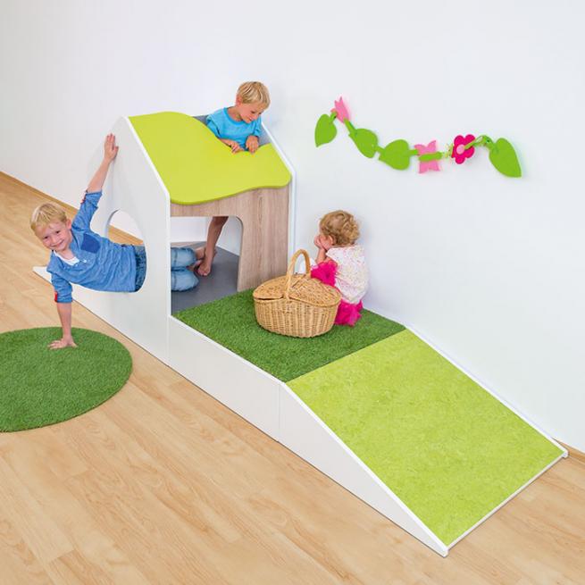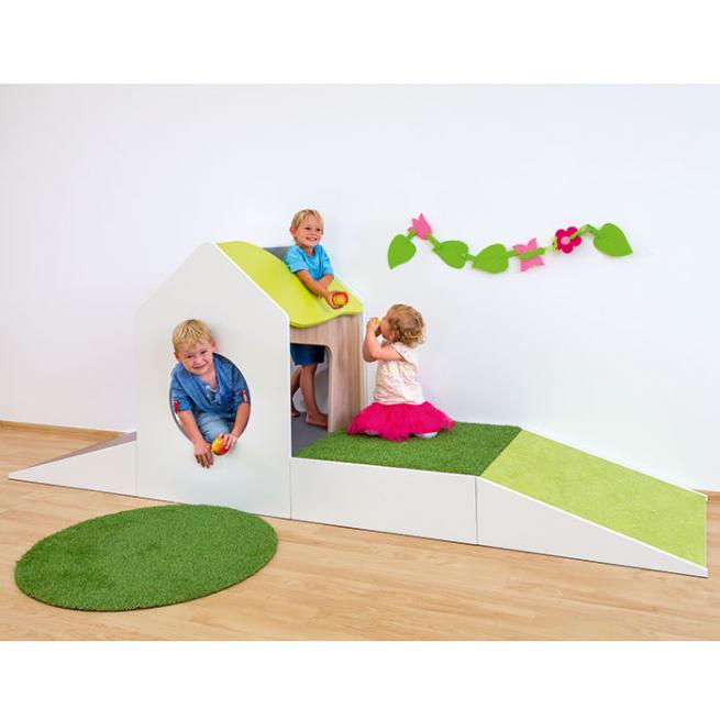 Spiellandschaft mit eigenem Häuschen und Rasenfläche. Möglich machts das 4-teilige Podest-Set Bruno. Die Seite mit dem grünen Dach und der Öffnung erinnert an ein Baumhaus, die aufgemalten Biberschwanzziegel der anderen Seite an ein Wohnhaus. Durch das runde Fenster klettern die Kleinen besonders gern, bevor sie es sich auf dem Grasteppich gemütlich machen und z. B. picknicken.