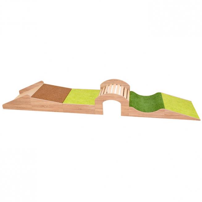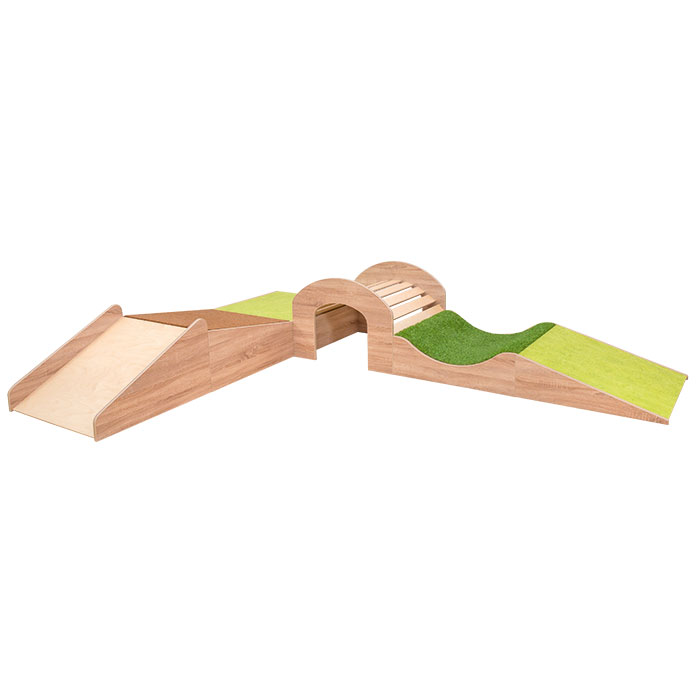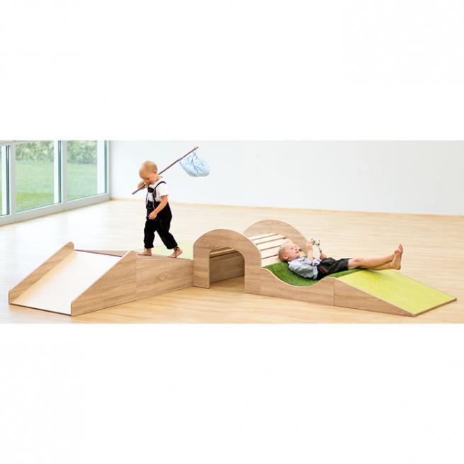 6-teilige Abenteuer-Spiellandschaft. Auf dem Podeste-Set David gehts hoch, runter, drunter und drüber, wenn Ihre Kinder durch den Tunnel krabbeln, darüber balancieren oder in der mit Grasteppich belegten Senke ein kleines Nickerchen machen. Ein toller Spielspaß, sogar mit Rutsche.