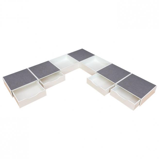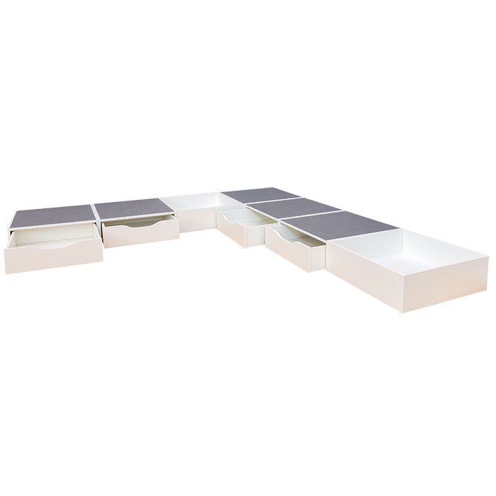 Aus dem 7-teiligen Podeste-Set Ferdinand kreieren Sie im Nu eine tolle Spiellandschaft mit praktischen Stauraumlösungen. Befüllen Sie die beiden offenen Elemente z. B. mit Bällen und schenken Sie Ihren Kindern damit jede Menge Spaß im Bällebad. In den 4 ausziehbaren Rollkästen verstauen Sie beispielsweise Bauklötze oder andere Spielzeuge, die auf den Podesten zum Einsatz kommen.