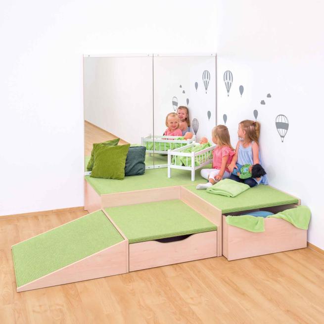 -materialien, mit denen Ihre Kinder am liebsten auf den Podesten spielen. In den beiden Wandspiegeln aus Sicherheitsglas beobachten die Kinder ihr Spiel und sind fasziniert vom eigenen Spiegelbild.