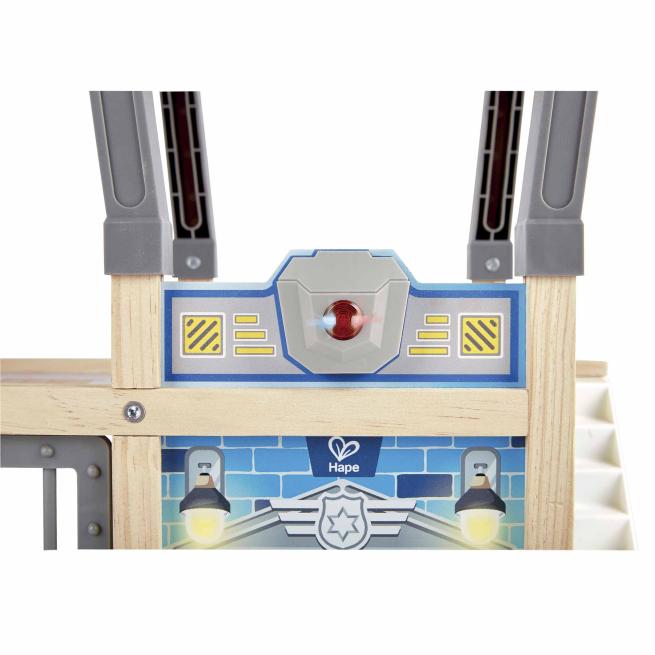 Die Polizeistation aus robustem Holz bietet Kindern mit 2 Stockwerken und 3 Ebenen zahlreiche Spielmöglichkeiten. Ausgestattet ist die Polizeistation mit Helikopterlandeplatz, Stellplatz fürs Polizeiauto und einer Gefängniszelle. Sogar Sound- und Lichteffekte gibt es. Zahlreiches Zubehör, die 3 Spielfiguren Polizist, Polizeihund, Verbrecher und einen Helikopter sowie ein Polizeiauto sind ebenfalls enthalten. Ohne Knopfzelle, zur einfachen Selbstmontage.