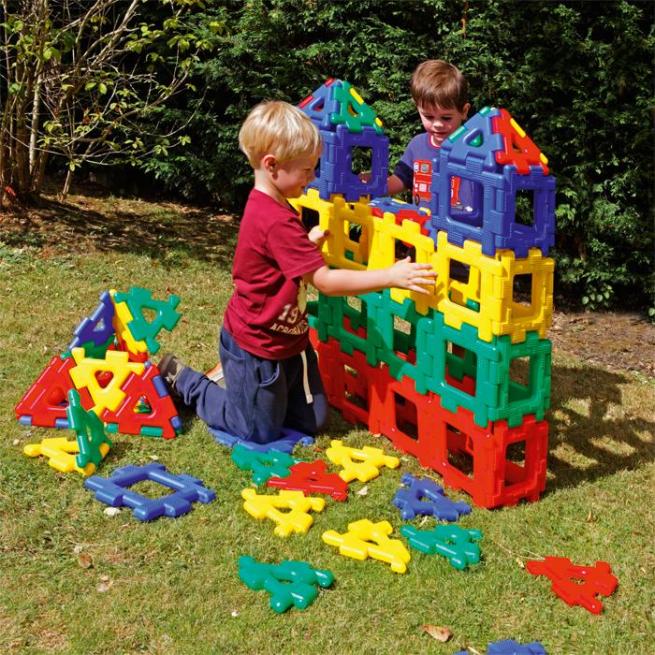 Kinder setzen die extragroßen Bauteile leicht zusammen. Im Handumdrehen entstehen Formen und dreidimensionale Bauwerke. Das Spiel mit den quadratischen und dreieckigen Elementen fördert Kreativität und räumliche Vorstellung. Altersempfehlung: ab 2 Jahren.