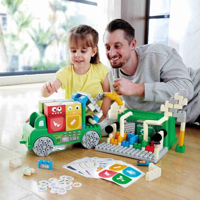 Der Müllsortier-Lkw bietet mit insgesamt 101 Teilen vielfältige Möglichkeiten zum Bauen, Spielen und Lernen. Dabei vermittelt er Kindern auf spielerische Weise die Grundlagen der Abfallentsorgung. Das Set besteht aus 86 bunten Bausteinen, 4 Abfallcontainern sowie Müll-Sortierkarten, mit denen Kinder Gegenstände der richtigen Tonne zuordnen. Aus dem Lkw mit Transportbox bauen Kinder eine Müllsortieranlage. Ergänzt wird das Set durch informative Karten, die hilfreiche Anleitungen und neue Spielideen liefern. Für unbeschwerten und sicheren Spielspaß sind alle Bausteine aus flexiblem Material gefertigt und verfügen über abgerundete Ecken und Kanten – ideal für neugierige Kinderhände im Kindergarten- und Vorschulalter.