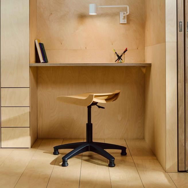 Die Holzmix-Sitzschale des Postura+ Drehhockers