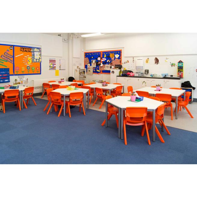 - Für die Arbeitshaltung – nach vorne gelehnt am Tisch schreibend – ist der vordere Teil der Sitzfläche leicht nach unten abgeschrägt. So zirkuliert das Blut besser in den Beinen Ihrer Schüler.