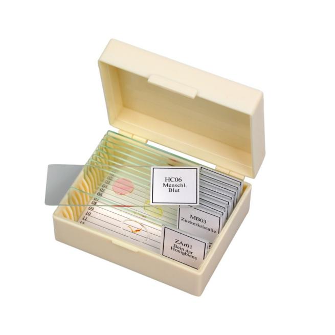 Fertigpräparate helfen Ihnen, Ihre Schüler für die Welt des Mikrokosmos zu begeistern. Das Präparateset enthält 10 Objektträger aus Glas mit interessanten Präparaten, die Freude an der Mikroskopie wecken. Jedes Präparat ist mit einer Beschriftung versehen. Die praktische Sortierbox bietet Platz für 15 Objektträger. Das ermöglicht, noch 5 weitere Präparate in der Box aufzubewahren. Das Präparateset erleichtert Ihren Schüler die ersten Schritte zum selbstständigen Mikroskopieren.