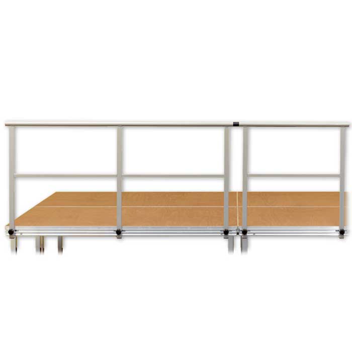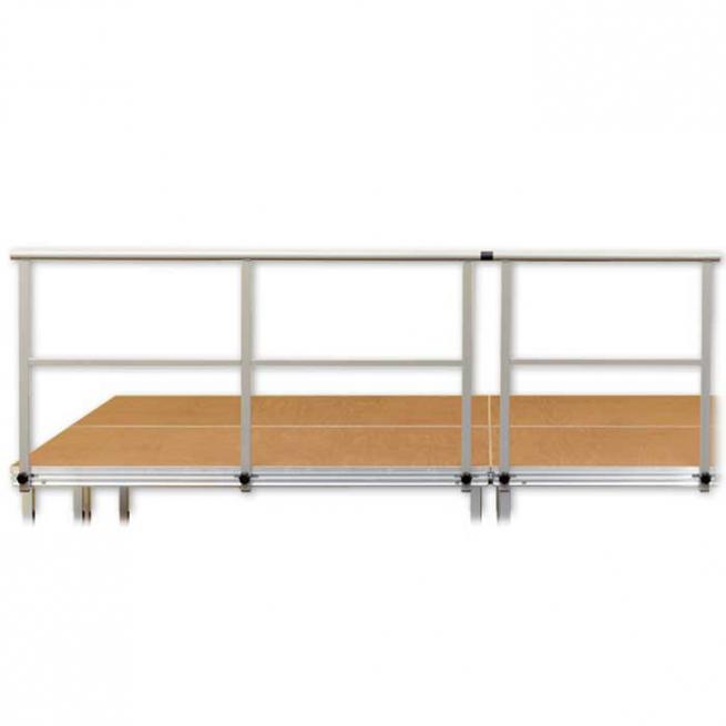 An den äußeren Bühnenelementen bringen Sie Geländer an. Die Geländer sind in 200 und 100 cm-Stücken erhältlich. Das Montagematerial wird mitgeliefert.