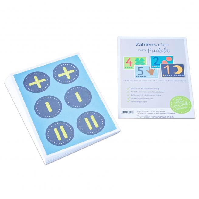 22 Karten mit Zahlen und Rechenzeichen (2 x Zahlen von 1-10, 1 x Zahl 0, 1 x Rechenzeichen)