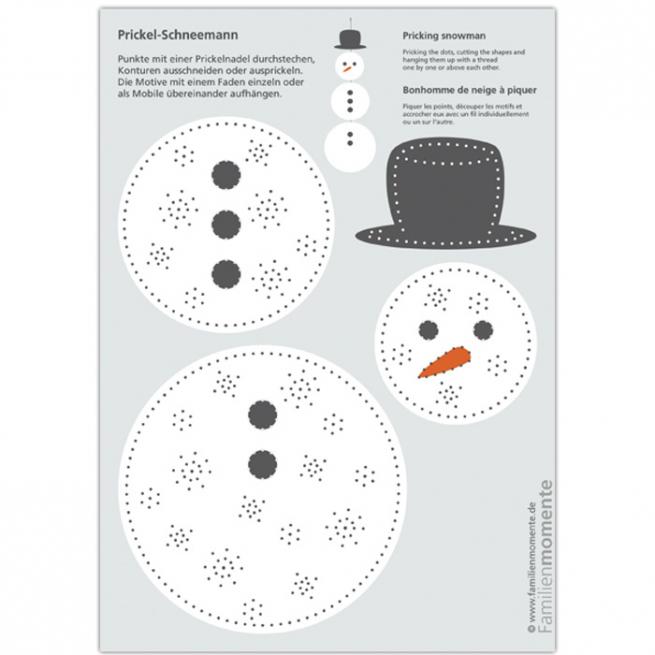 Witzige Winterbegleiter prickeln Ihre Kinder aus den Schneemann-Prickel-Vorlagen. Hut, Kopf, Bauch und Rumpf sind vorgezeichnet, sodass Ihre Kinder sofort losprickeln können. Dann noch gemeinsam sorgfältig ausschneiden und beispielsweise mit einem Nylonfaden auffädeln. Sehen an Fenstern lustig aus und sind auch Wänden oder Ästen ein toller Hingucker. Ab 4 Jahren.