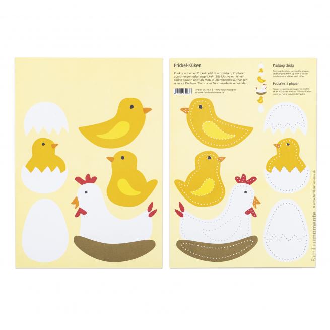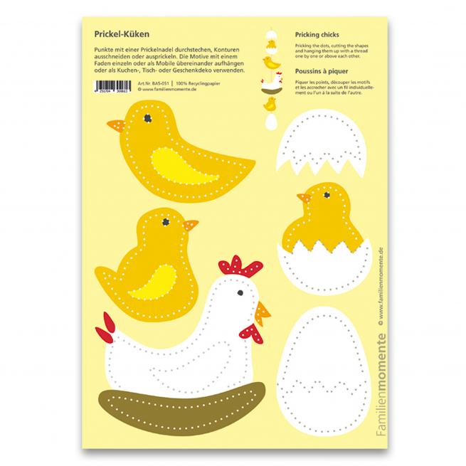 Superfixe Dekoidee ohne Vorbereitungszeit. Die Motive sind bereits durch Punkte vorgezeichnet. Einfach die Punkte mit einer Prickelnadel durchstechen, geprickelte Motive an einem Faden aufhängen – fertig ist das Mobile.