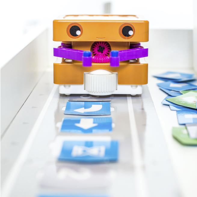 Die Kinder bauen unterschiedliche Roboter-Modelle, z. B. mit beweglichen Armen. Und dann lassen sie den kleinen Sammy ganz ohne Rechner, Tablet und Apps einfach in verschiedene Richtungen fahren oder spielen Sounds ab und lassen seine LED-Lichter leuchten. Die Robotereinheit reagiert ausschließlich über die beiliegenden Coding-Karten. Durch Aneinanderlegen der Karten entsteht ein einfacher Befehl für den lustigen Lernroboter. Mithilfe eines optischen Sensors kann Sammy den Befehl auslesen und ausführen.