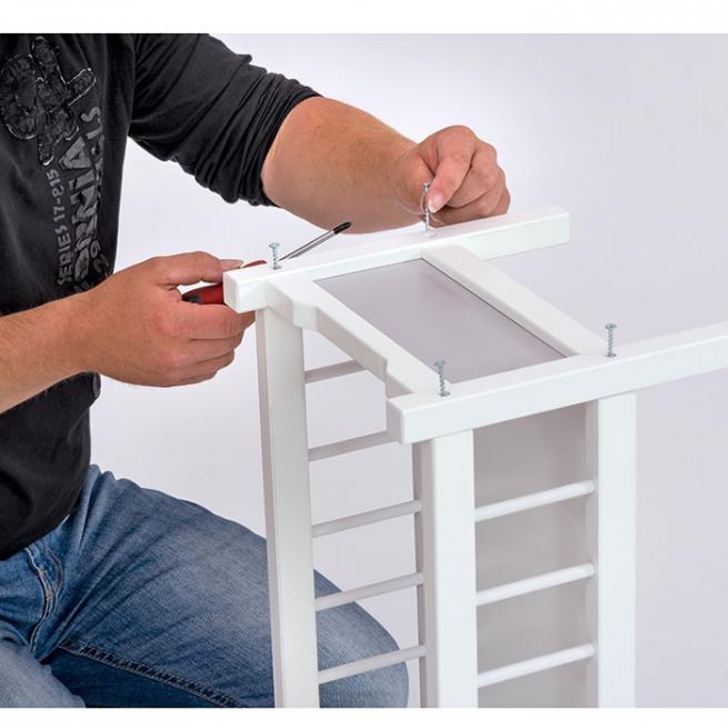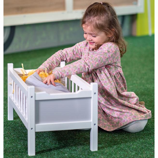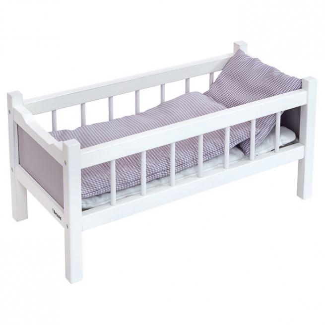 Puppenbett aus massivem Buchenholz in Weiß und Grau lackiert für Puppen bis zu einer Größe von 48 cm. Zur einfachen Selbstmontage. Inklusive Aufbauanleitung.