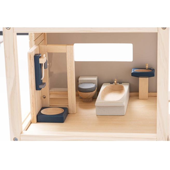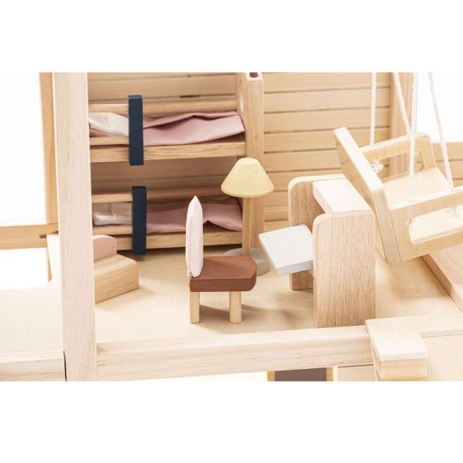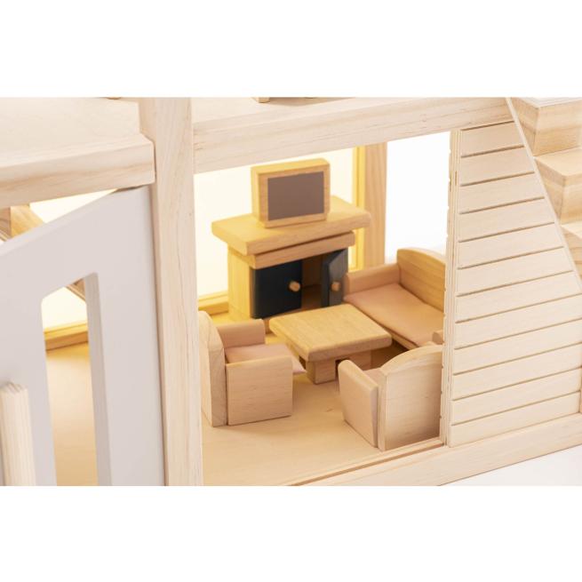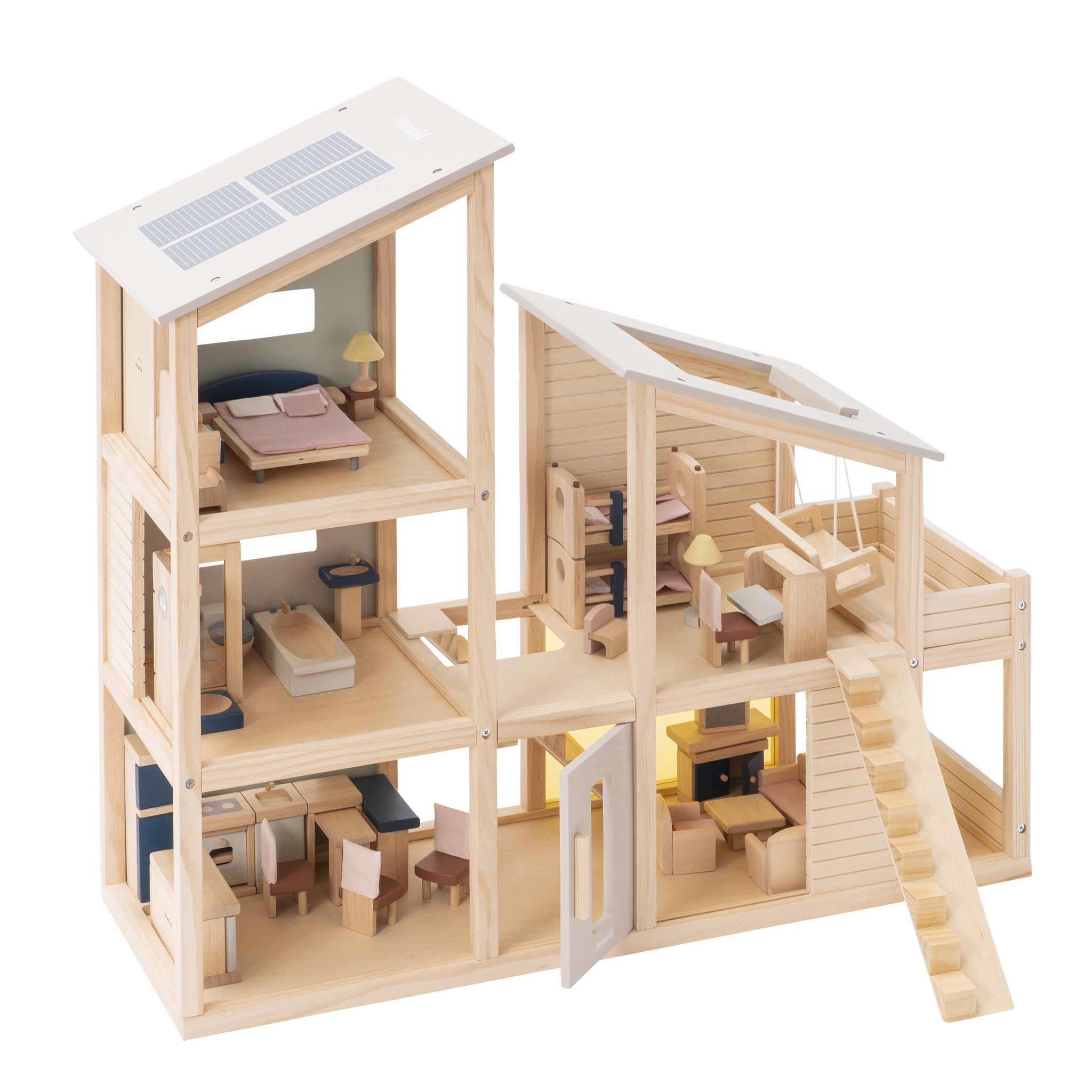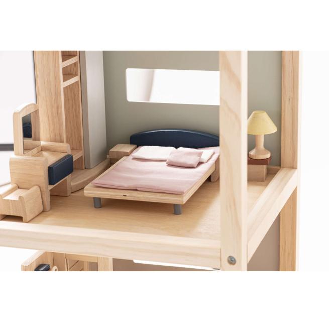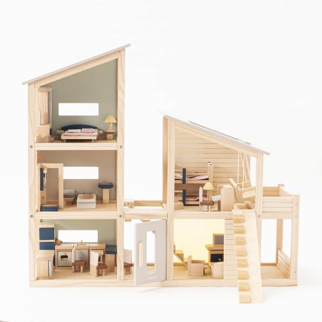 Das dreistöckige Puppenhaus mit 5 Zimmern, Balkon und Garage bietet Kindern viel Potenzial zum Kreieren spannender Spielwelten. Erhältlich ohne oder mit Möbeln für Wohn-, Ess-, Bade-, Kinder-, Schlafzimmer und Küche.