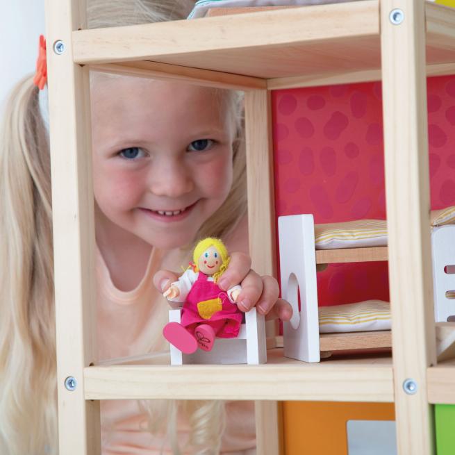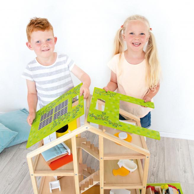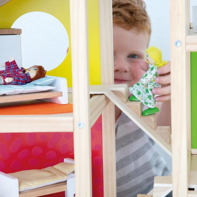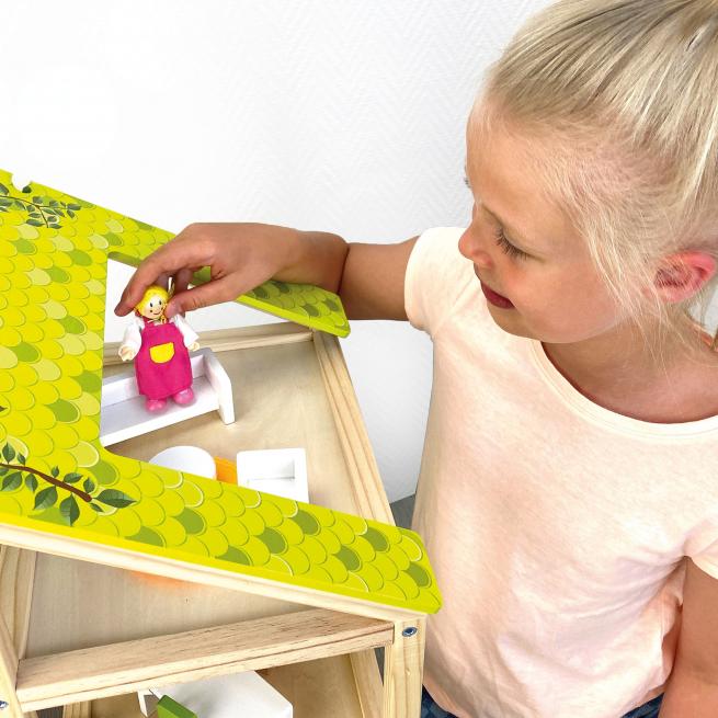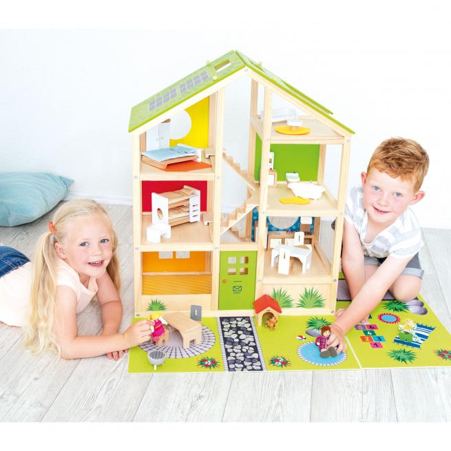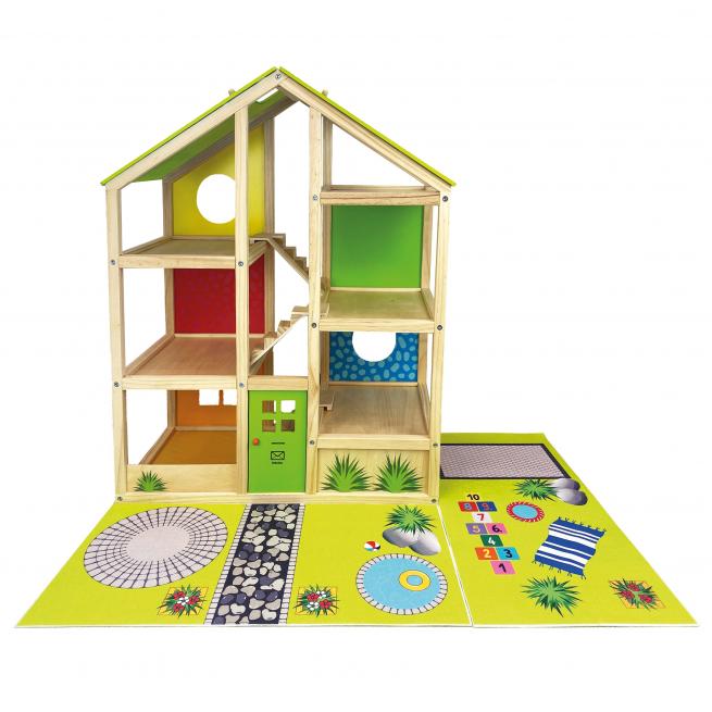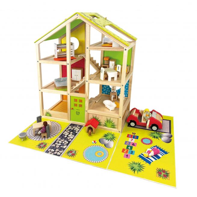 Sechs Zimmer inklusive Ausstattung (ohne Auto) und zwei Filzmatten mit Garten-, Liege und Parkplatz-Aufdruck als Außenbereich. Sogar die Familie samt Hund ist inklusive. Dank der Komplett-Ausstattung spielen Ihre Kinder gleich drauflos. Das Dach legen die Kinder selbst auf und bespielen das Puppenhaus auch von ganz oben. Die Treppen und die Möbel ordnen sie so an, wie es ihnen gefällt. Der Außenbereich des Hauses beflügelt die kindliche Fantasie zur Kommunikation und für Rollenspiele. Hier ist Platz für die Hundehütte, den Grill, ein Auto und es gibt sogar einen kleinen Teich sowie ein Hüpfspiel.