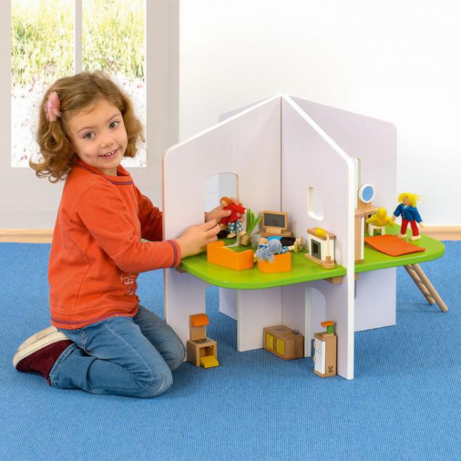Durch die offene Bauart spielen mehrere Kinder gleichzeitig an diesem toll durchdachten Puppenhaus. Insgesamt stehen 8 Spielbereiche auf 2 Ebenen zur Verfügung. Im Zusammenspiel trainieren die Kinder den Wortschatz und soziales Verhalten. Kinderleichter Aufbau – das Haus stecken Sie einfach „nur“ zusammen! Inklusive Leiter.
