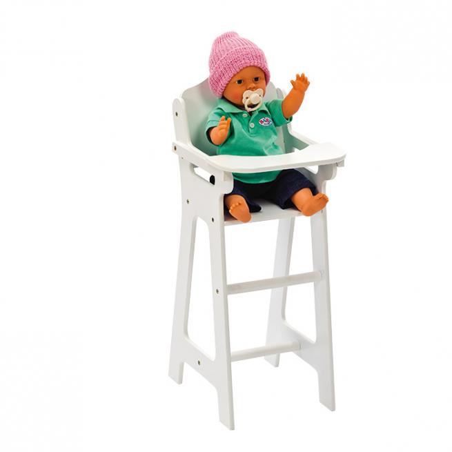 Schöner Puppenhochstuhl aus weiß lackiertem Schichtholz, mit kleinem Herzausschnitt an der Rückenlehne.