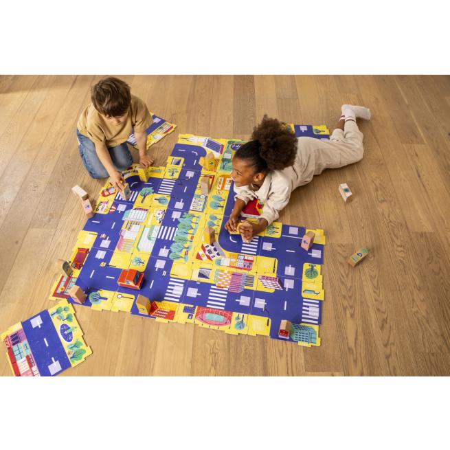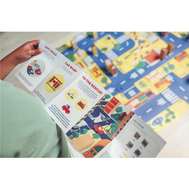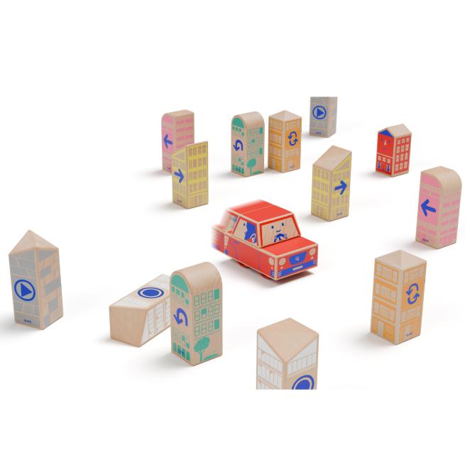 • 22 hölzerne Code-Blöcke mit Fahrbefehlen, 16-teiliger Stadtplan