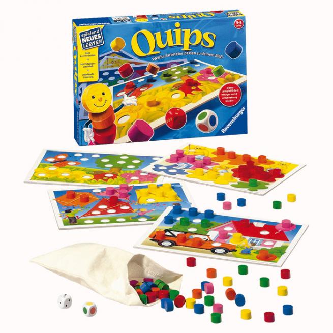 4 Legetafeln, 90 Holzsteine in 6 Farben, 1 Punktwürfel, 1 Farbwürfel, 1 Stoffbeutel