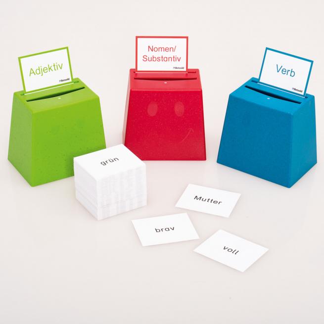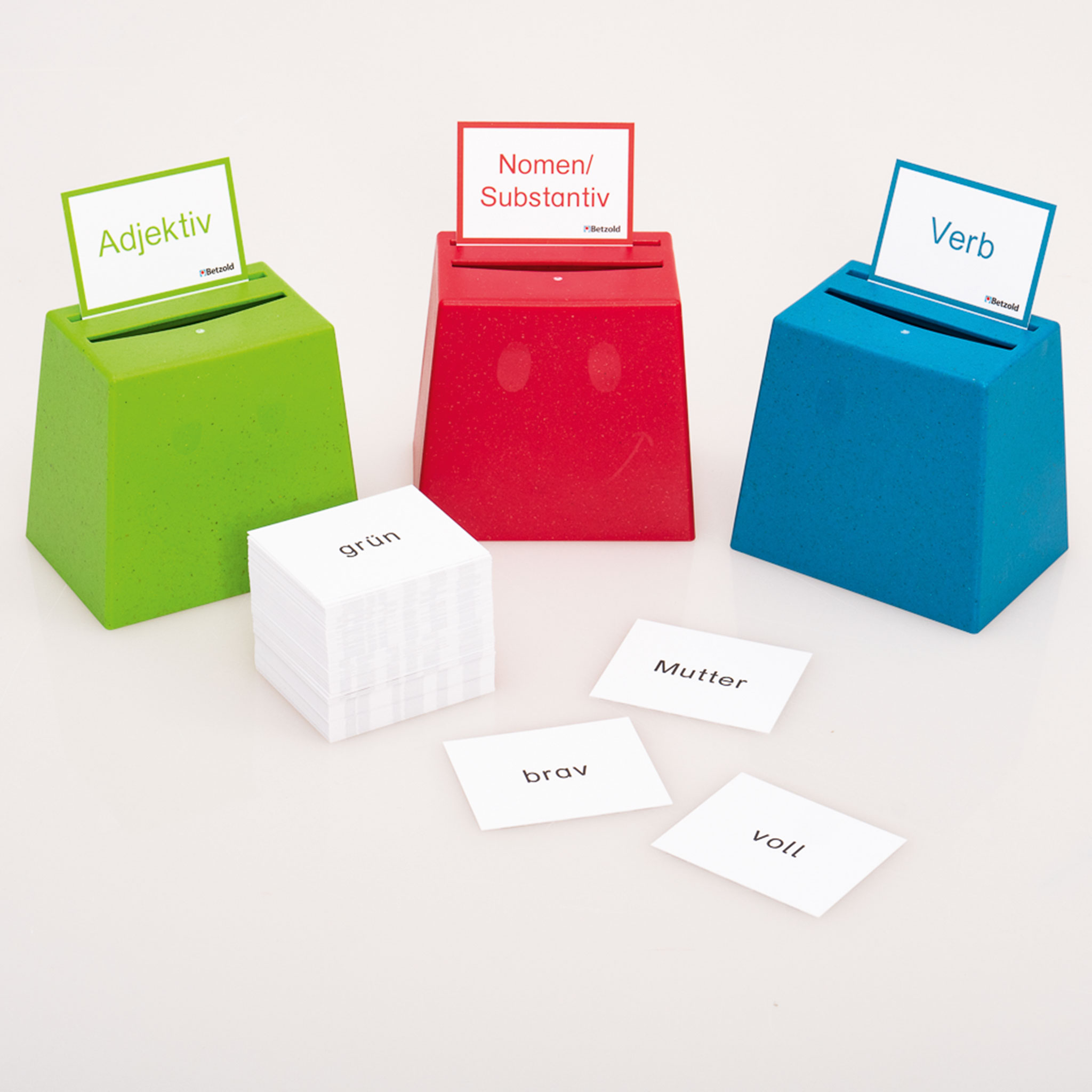 Die Kinder stecken die 3 Aufgabenkarten jeweils in die Kerbe der Becherquizzer. Die 99 Sortierkarten legen sie auf den Tisch und überlegen, zu welcher Wortart das jeweilige Wort gehört. Die entsprechende Karte schieben Sie dann in den entsprechenden Becherquizzer. Zur Selbstkontrolle vergleichen sie abschließend das Lösungsmuster der Sortierkarten mit dem der Aufgabenkarten. Optimal auch für die Freiarbeit oder das Stationenlernen.