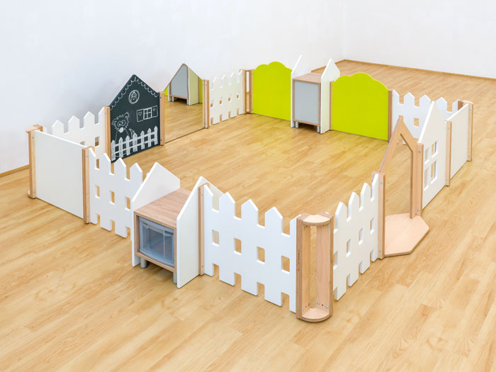 EduCasa-Möbel unterstützen die kindlichen Bedürfnisse nach LACHEN LEBEN LERNEN sowie selbstständigem Spielen von Beginn an. Die individuell einsetzbaren Elemente sind gleichsam Spielmöbel und Raumgestalter, mit denen Sie verschiedene Raum-in-Raum-Konzepte umsetzen und nebenbei unterschiedliche Spiel-Lern-Räume schaffen. Durch Türbogen oder Tunnel verbinden Sie diese Spiel-Lern-Räume miteinander. Noch mehr Spiel-Lern-Räume entstehen, wenn Sie die passenden Regale und Aufsätze mit dem Trennwand-System kombinieren …