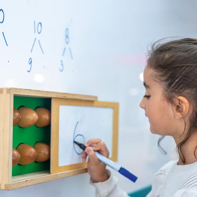 Nehmen Sie beispielsweise 4 Eier aus der Box und fragen Sie Ihre SuS, wie viele noch in der Box sind. Schreiben Sie zunächst die Rechenaufgabe und dann das Ergebnis auf den Whiteboarddeckel: 10 – 4 = 6.