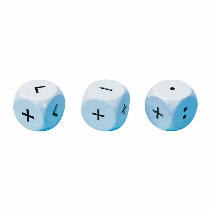 Würfel aus Holz, 18 mm Kantenlänge, bedruckt mit den angegebenen Rechenzeichen.