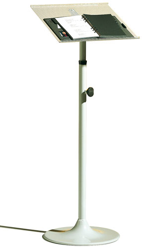 Leicht höhenverstellbar durch Rändelschraube. Manuskriptablage aus Lochblech mit Abrutschkante. Stabiles Stahlrundrohr-Gestell mit Tellerfuß.