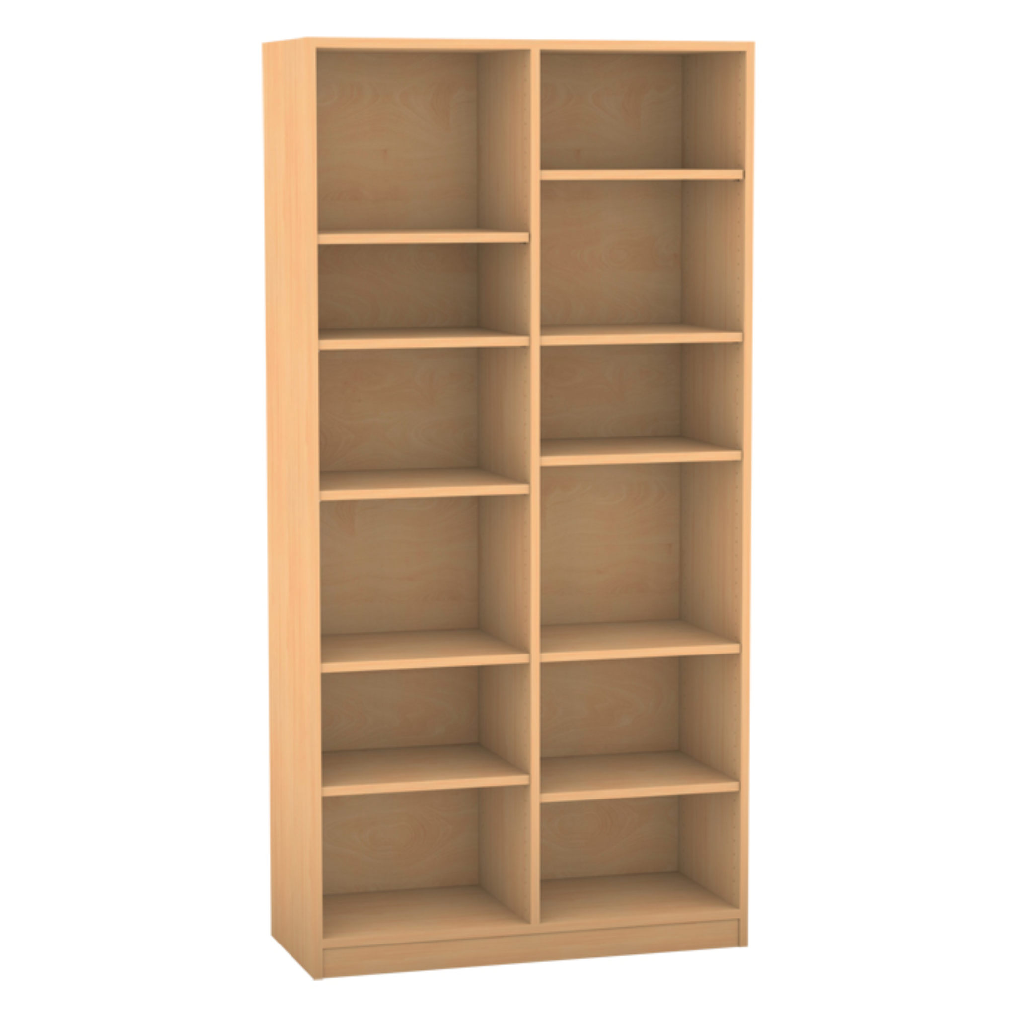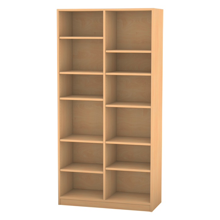 Praktisches Regal mit sehr stabilem Korpus und Sockel. Die Mittelwand verringert die Fachbreite, dadurch sind die Böden belastbarer.