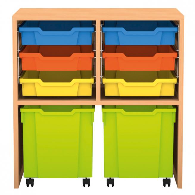 Regal mit 6 flachen Boxen und 2 fahrbaren XL-Boxen