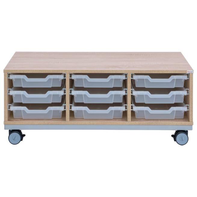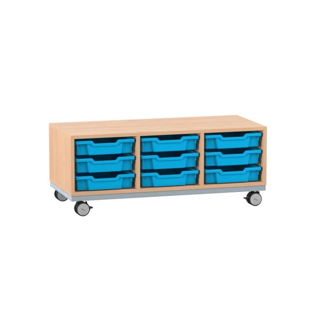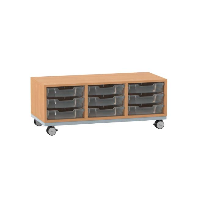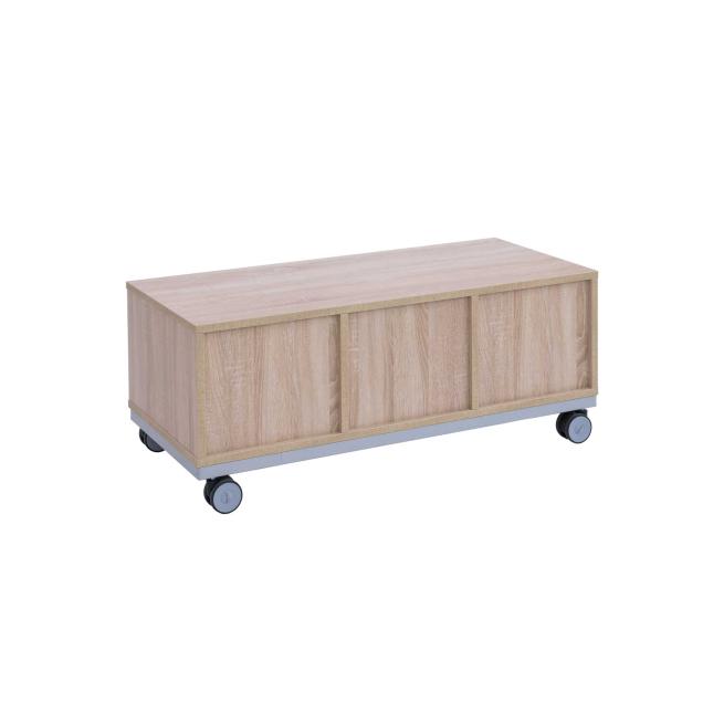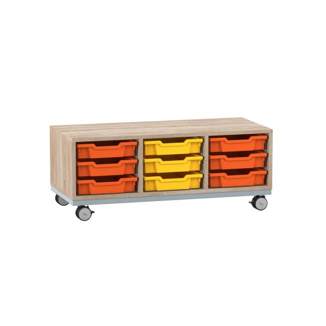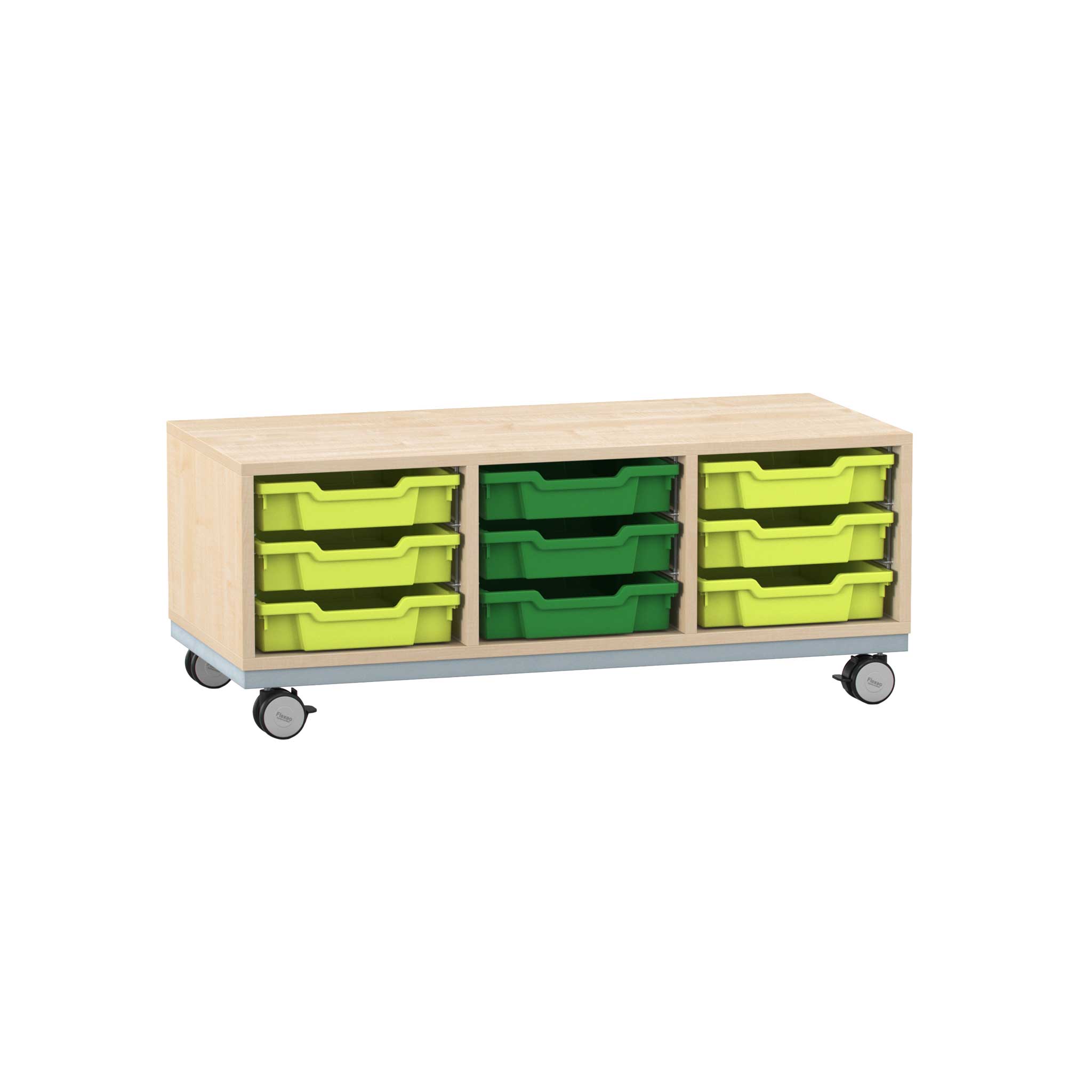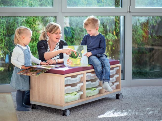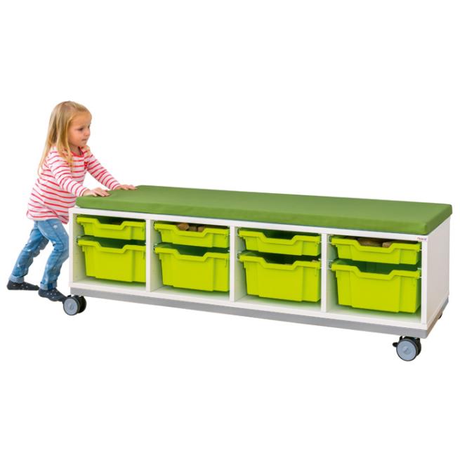 Funktionelle Ordnung. Das Regal mit Stahlrahmen-Verstärkung und flachen Boxen ist praktischer Aufräumhelfer und Sitzgelegenheit zugleich. Dank Sichtrückwand nutzen Sie das Regal auch als Raumteiler. Mithilfe der 4 Rollen verschieben Sie es einfach dorthin, wo Sie es brauchen. Dabei bieten die 2 feststellbaren Rollen festen Halt. Besonders stabil ist das Regal auch durch die 8 mm starke Rückwand.