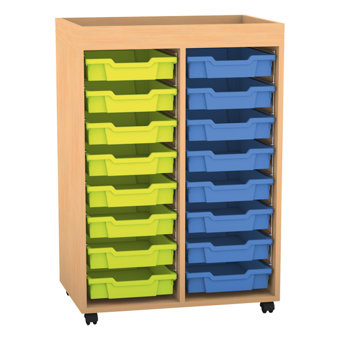 Ordnung mit Überblick. Schaffen Sie Stauraum, wo hohe Regale unpraktisch wären. Die Sichtrückwand macht aus diesen Regalen mit farbigen, flachen oder hohen Boxen die perfekten Raumteiler. Ergänzen Sie beispielsweise mittelhohe Regale und behalten Sie in neu abgetrennten Räumen den Überblick. Mit den Gratnells-Boxen wird Flexeo® zu Flexeo® PRO. Dank der Führungsschienen nutzen Sie die Boxen wie Schubladen. Für Stabilität sorgt die 8 mm starke Sichtrückwand. Die qualitativ hochwertige Melaminharzbeschichtung ist robust und trotzt den jahrelangen schulalltäglichen Belastungen. Abnutzungserscheinungen werden durch die 2 mm ABS-Kante verhindert, denn sie bietet Schutz vor Stößen und Feuchtigkeit. Verschmutzungen wischen Sie einfach feucht ab.