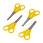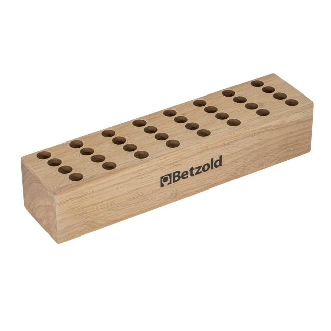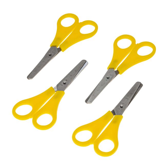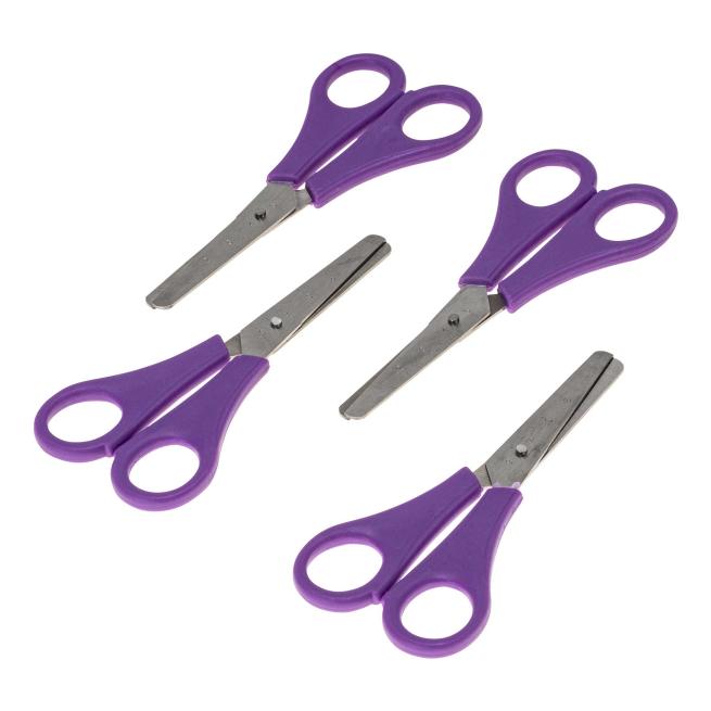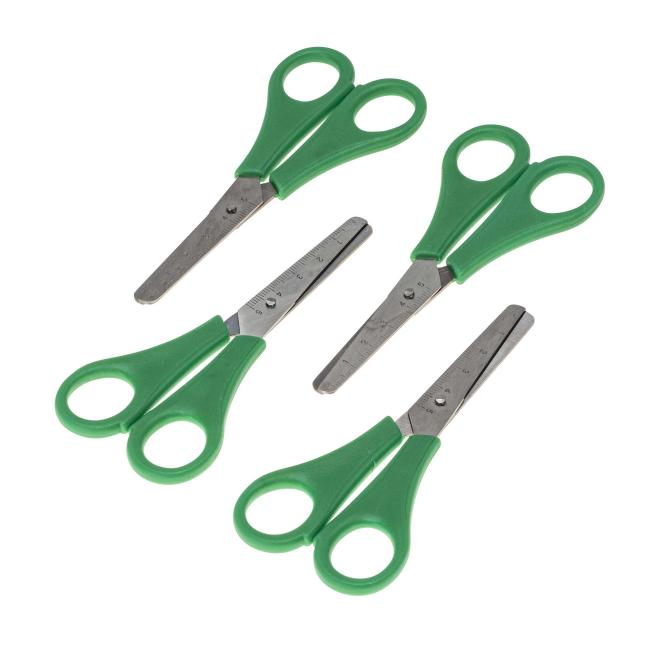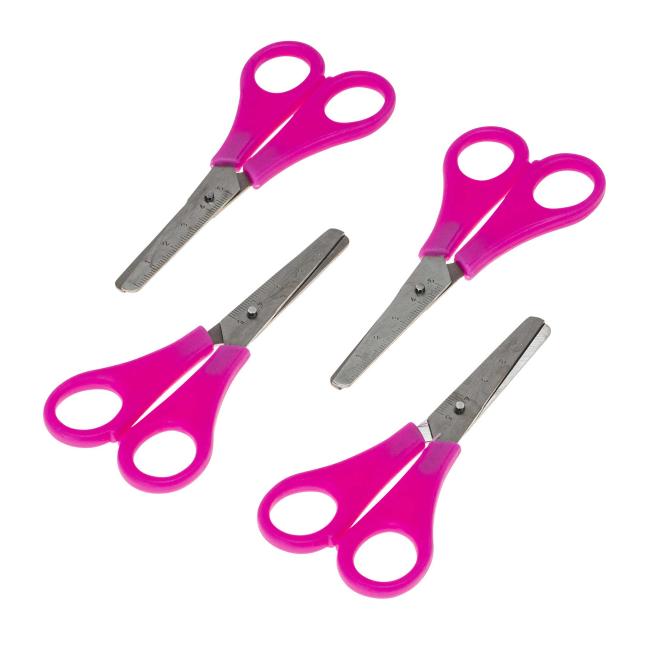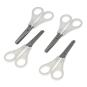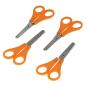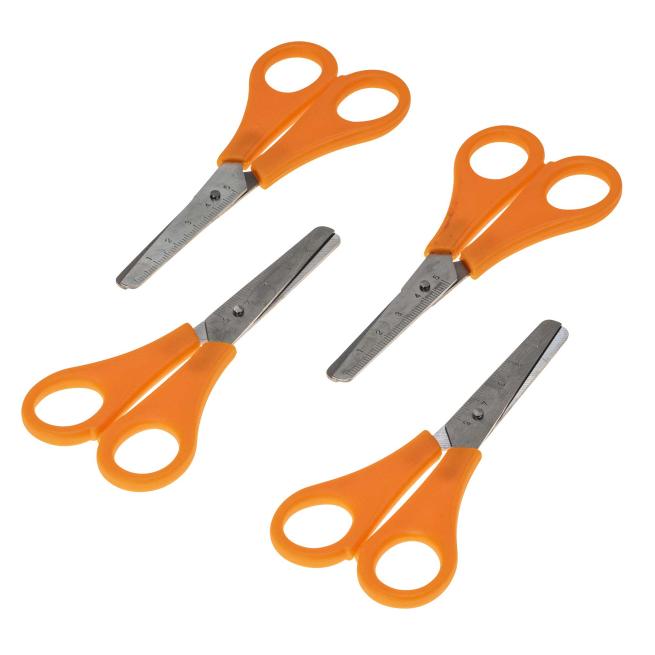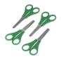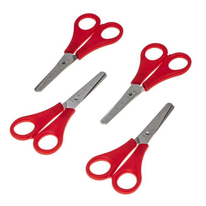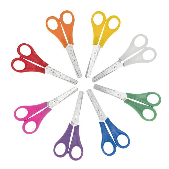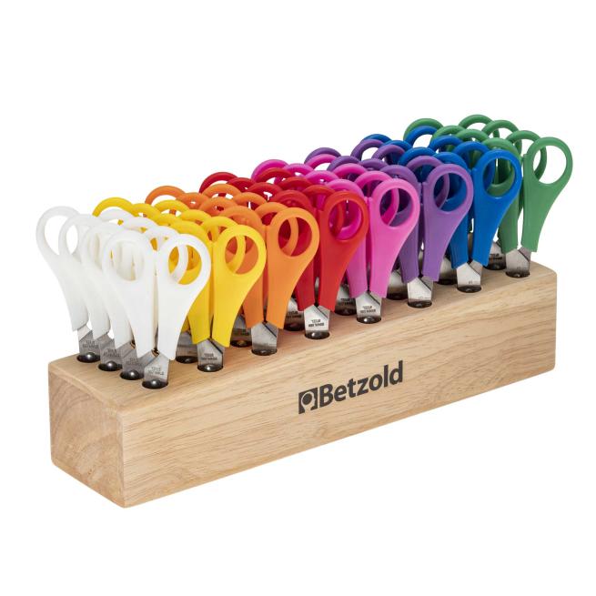 Insgesamt 32 runde Bastelscheren, 28 Rechtshänder- und 4 Linkshänder-Scheren. Mit farbigen Kunststoffgriffen. Für die ideale Aufbewahrung sorgt der Holzständer.