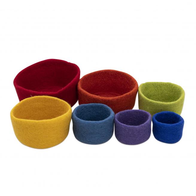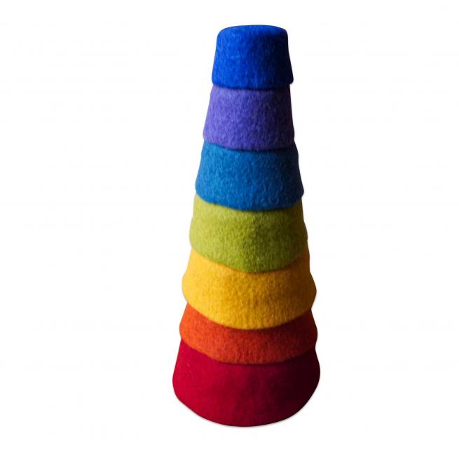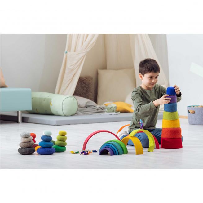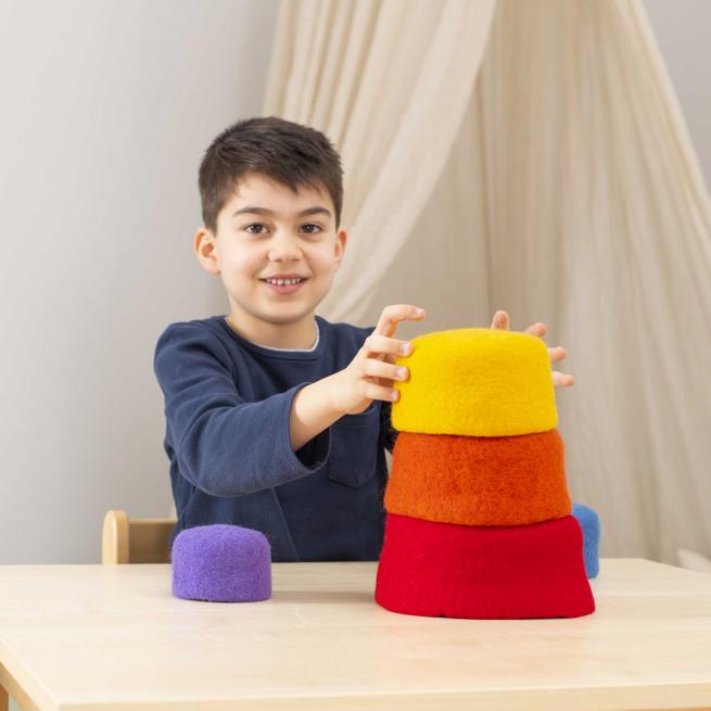 Bestens geeignet zum Sortieren, Türme bauen, in- sowie aufeinanderstapeln und zum Trainieren der Farbwahrnehmung. Optimal kombinierbar mit weiteren Filzprodukten in Regenbogenfarben.