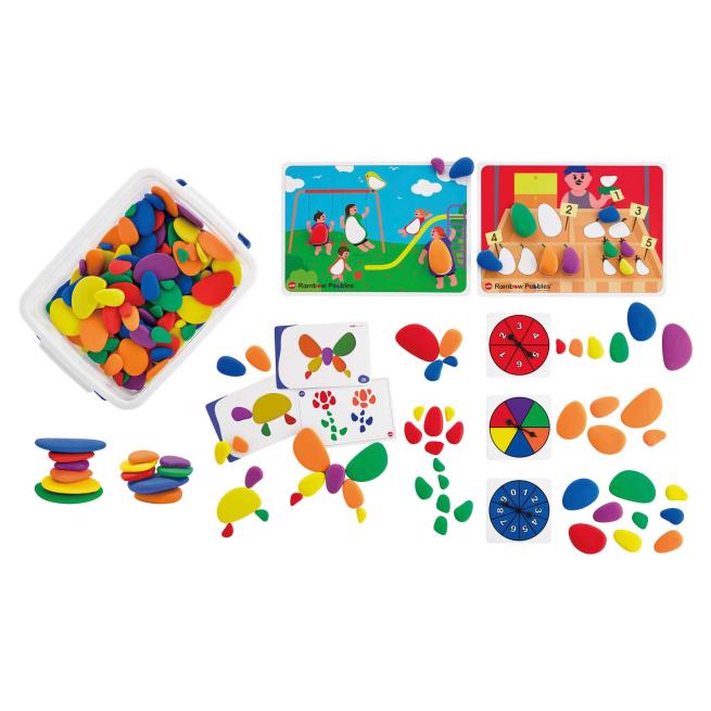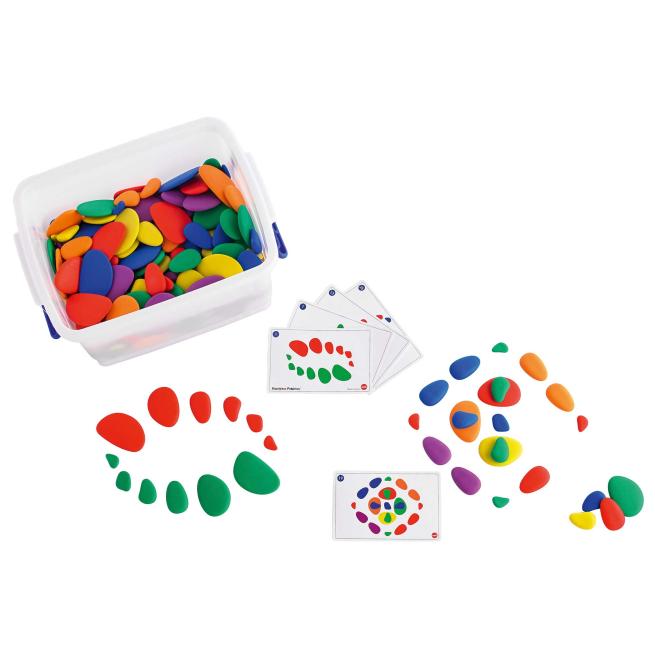 Zählen und das Verständnis von Mengen lernen Kinder anhand der farbenfrohen Regenbogenkiesel. Auch Sortieren und Konstruieren sowie erstes Addieren und Subtrahieren entdecken sie mit den Kieseln spielerisch. Die 252 Steine in 6 Farben und unterschiedlichen Größen kombinieren die Kinder nach Lust und Laune zu Gruppen, Formen und Skulpturen. Super fürs logische Denken und die kindliche Feinmotorik. Auch für jüngere Kinder sind die abgerundeten Steine gut greifbar. Als Anregung zum Spielen und Bauen liegen dem Set 47 Spielkarten mit Abbildungen verschiedener Aufgaben bei. Diese lösen die Kinder entweder eigenständig, gemeinschaftlich oder mit Ihnen zusammen.