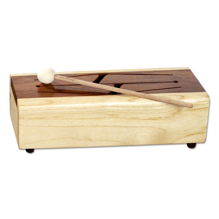 In der 2 cm starken Klangplatte befinden sich 4 Zungen. Damit erzeugen die Kinder verschieden hohe Töne. Das Instrument lässt sich ähnlich wie ein Bongo oder Agogo einsetzen. Es wird mit einem weichen Filzschlägel geliefert.