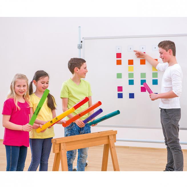Ohne Notenkenntnisse Takt und Rhythmus erlernen. Dafür ist das Farbsystem der BOOMWHACKERS® entwickelt worden. Die ideale Ergänzung für den Einstiegsunterricht ist das magnetische Tafelmaterial.