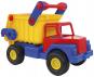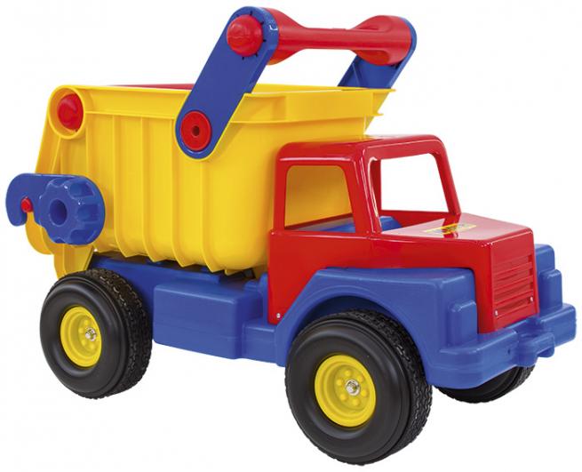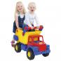 Der farbenfrohe Kipplaster ist aus stabilem Kunststoff gefertigt, abwaschbar. Dank des Schiebegriffs lässt sich der Truck leicht fahren.