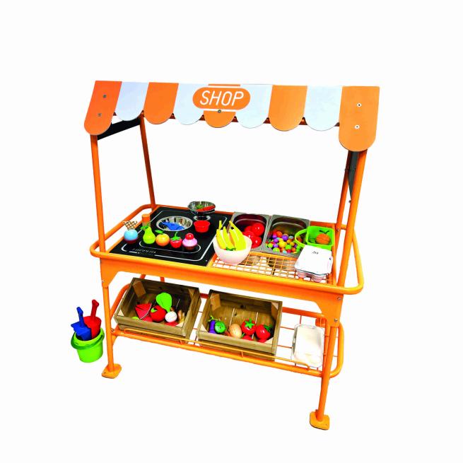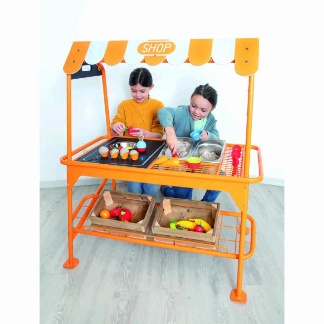 Die robuste Konstruktion aus Metall und Hartpolyethylen (HDPE) trotzt Wind und Wetter. Direkt im Sandkasten oder auch auf der Rasenfläche aufgebaut, entsteht eine kreative Verkaufsstation. Mit Heringen (nicht enthalten) fixieren Sie die Station und geben ihr zusätzlich festen Stand. Bitte lassen Sie die Station nicht rund ums Jahr draußen stehen. Eine Einlagerung bei extremen Wetterverhältnissen verlängert die Nutzung. Natürlich auch zum Bespielen in Innenräumen nutzbar.Rollenspiel-Station mit Lerneffekt