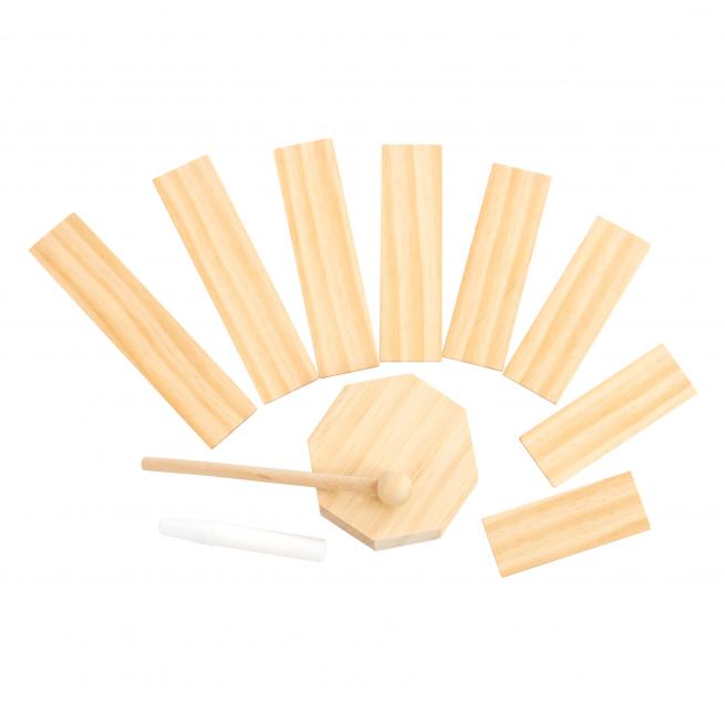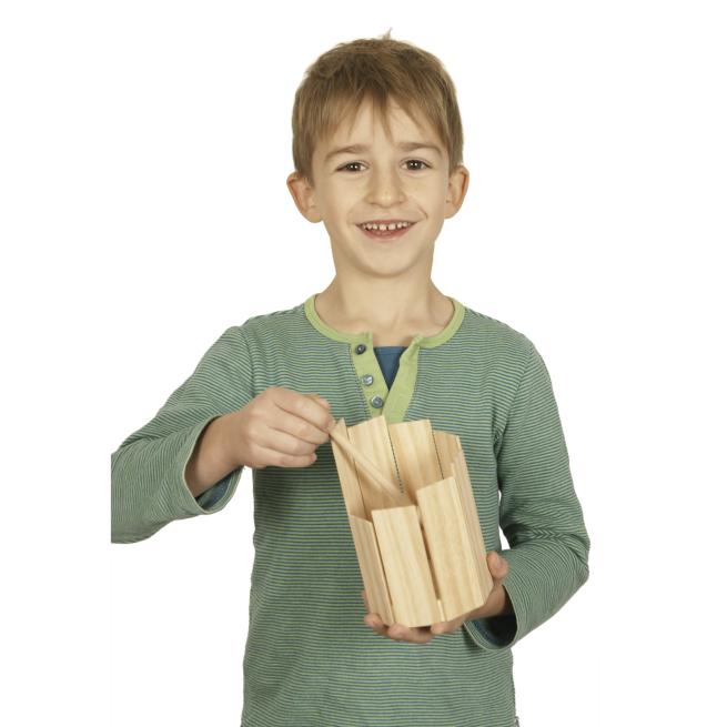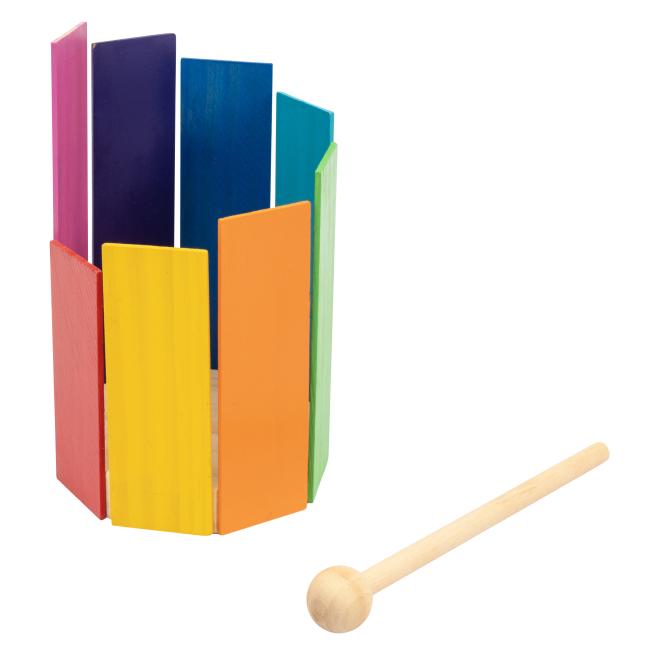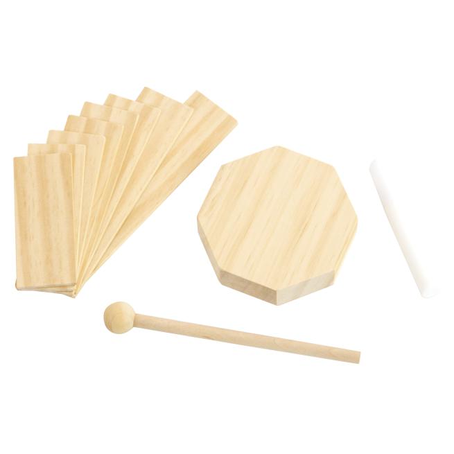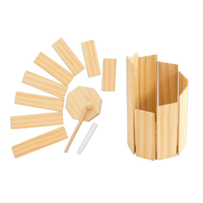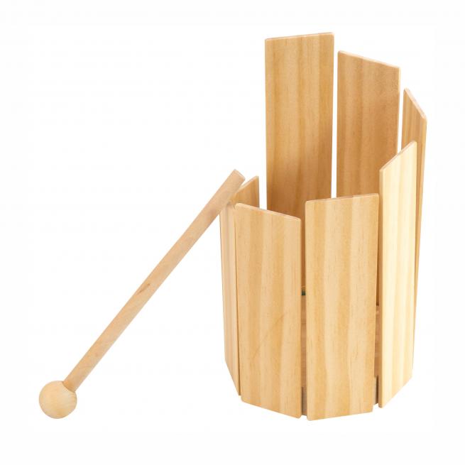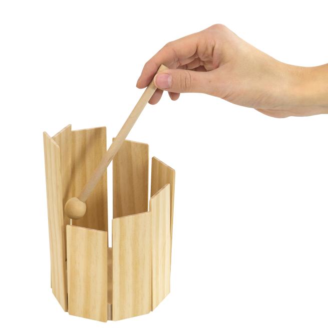 Diese Trommel hat es in sich: Mit ein wenig fachkundiger Hilfe bauen Kinder mit diesem Bausatz ihr erstes eigenes Instrument. Die unterschiedlich langen Klanghölzer werden der Größe nach rundherum an den Boden geklebt, so dass die Kinder der Trommel mit dem Schlägel von innen und außen Töne entlocken können. Das robuste, naturbelassene Spielzeug ist eine wunderbare Requisite für jegliche musikalische Untermalung. Ohne Holzleim. Ab 3 Jahren.