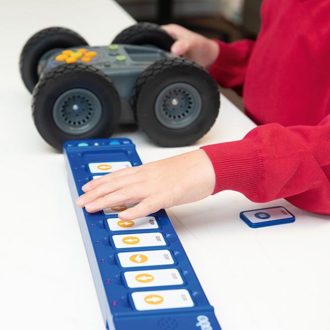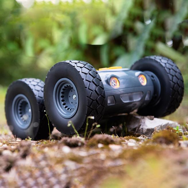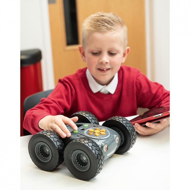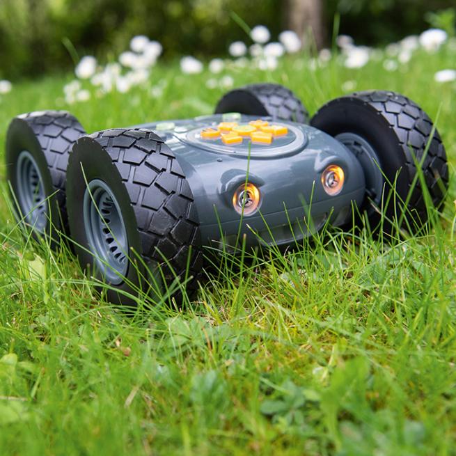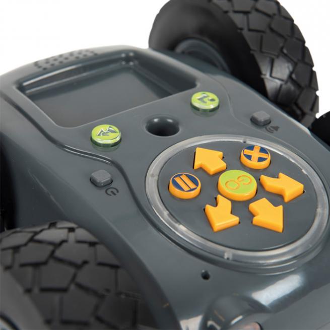 Durch Pfützen, über Steine oder die Wiese – mit dem robusten Geländeroboter haben Ihre Schüler besonders im Außenbereich großen Spaß. Bewegungsabläufe programmieren sie einfach über das Tastenfeld auf seinem Dach. Bis zu 200 Befehle können Sie einspeichern. Per Knopfdruck auf GO fährt der robuste Geländeroboter vorwärts, rückwärts, dreht sich links- bzw. rechtsherum oder macht eine Pause. Zudem kann er mithilfe der Vermeidungs-Taste auch Hindernisse erkennen und sie dann auf einer neuen Route umfahren. Seine Scheinwerfer leuchten dank Lichtsensor von selbst, wenn der Geländewägen eine dunklere Umgebung registriert.