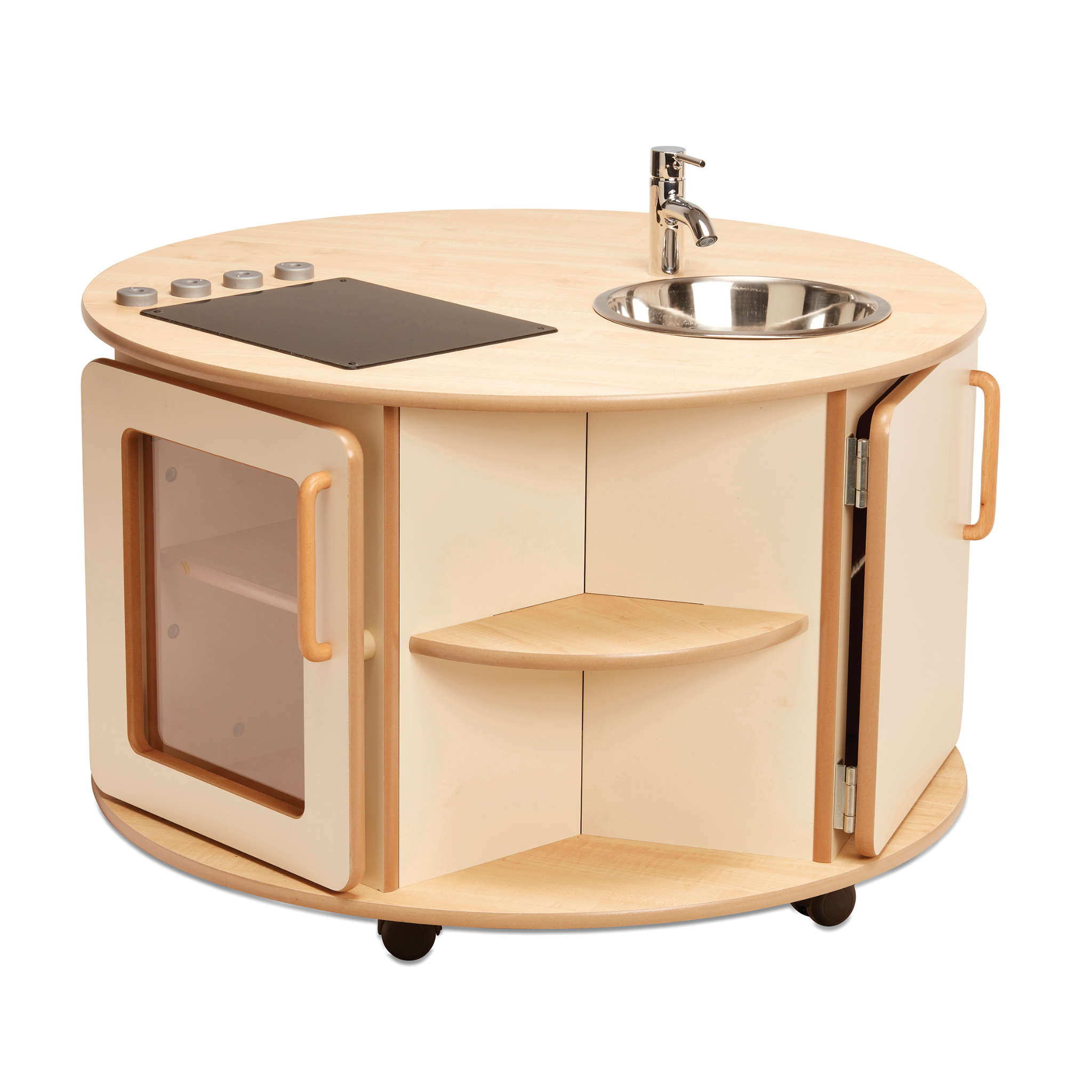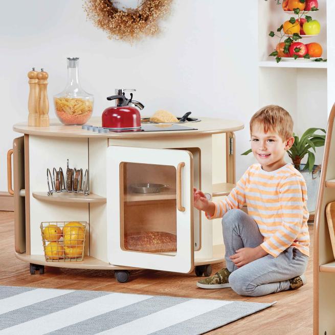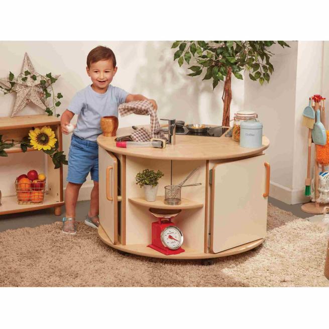 Kleine Chefköche gesucht! An der Runden Kücheninsel erfinden Kinder eigene Alltagsgeschichten rund um Küche und Kochen. Von allen Seiten erreichbar, arbeiten mehrere Kinder gleichzeitig an Töpfen, Reglern und Spüle. Erleben ein echtes Miteinander im Rollenspiel. Die kompakte Form bringt die Kinder nah zusammen und fördert Austausch, Sprache und Teamarbeit ganz von selbst. Dank der stabilen Rollen verschieben Sie die Kücheninsel aus robustem Birkensperrholz flexibel im Raum und schaffen immer wieder neue Spielsituationen. Beim Umstellen, Andocken und Neuordnen entwickeln Kinder räumliches Denken und Bewegungssicherheit.