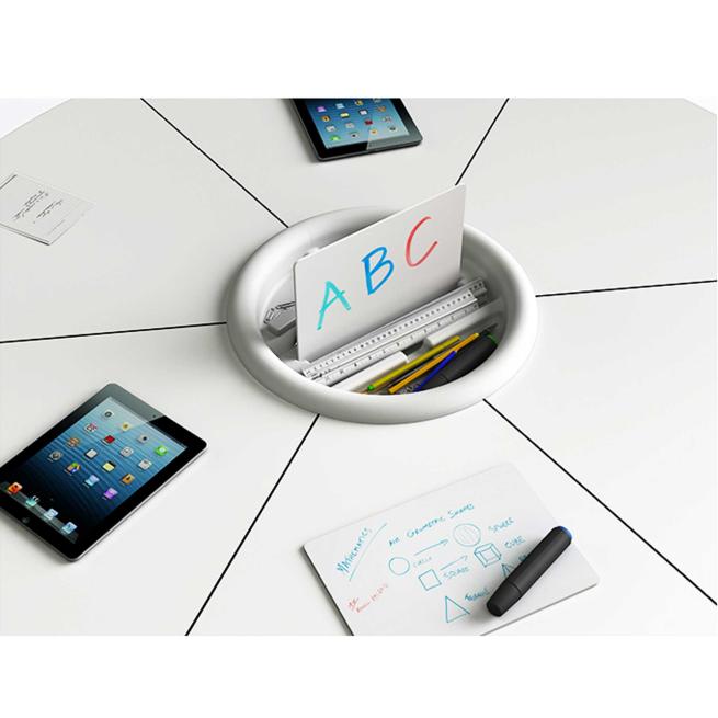 Die Zentralablage für Ihre zioxi t41-Schülertischgruppen bietet die perfekte Lösung, um die Tischflächen freizuhalten. Sammeln Sie hier Textmarker, Stifte, Lineale, Radiergummis und vieles mehr. Zusätzlich verfügt die Zentralablage für die Tischmitte über zwei Einschübe zum Aufstellen für Materialien bis DIN A4. Erhältlich in Limette oder Weiß.