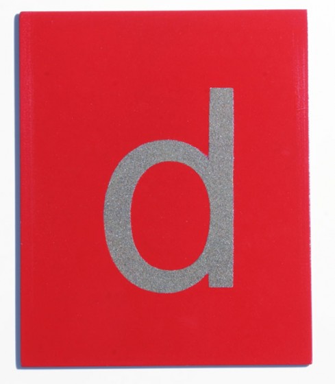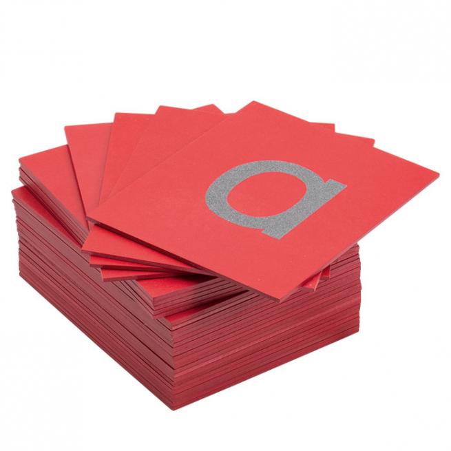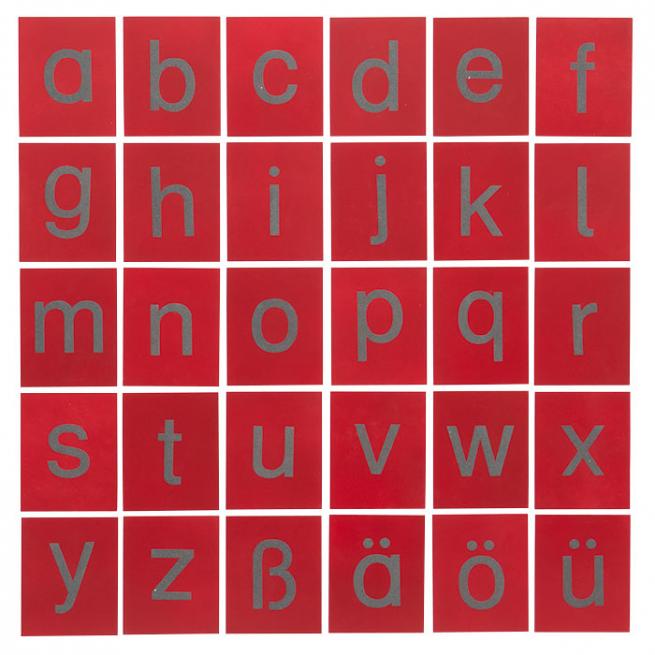 Fühl-Buchstaben auf rot lackierten Platten. Mit dem Finger fahren die Kinder den hervorgehobenen Buchstaben nach. Anschließend wird die ertastete Form nachgeschrieben.