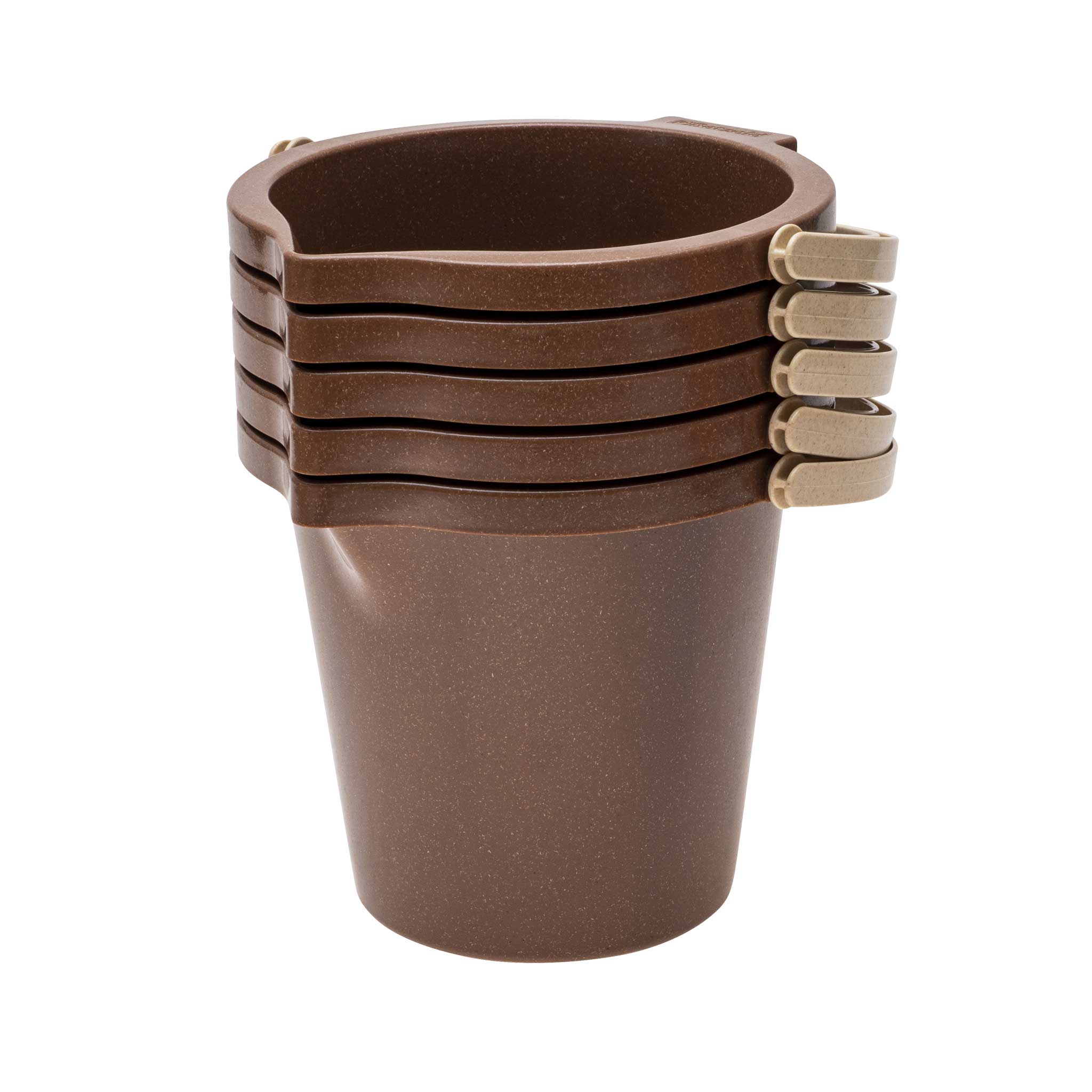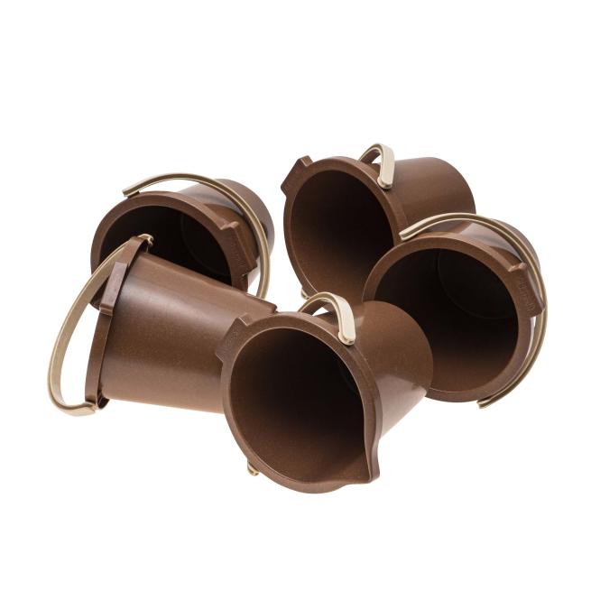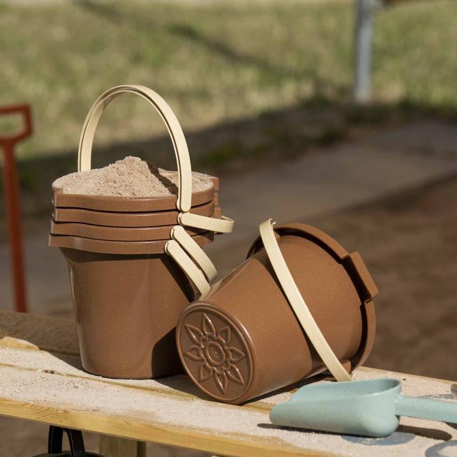 5 Sandspieleimer aus treeNside-Material in den Farben Curry, Türkis, Coral, Braun und GrünNACHHALTIG: Das treeNside-Material