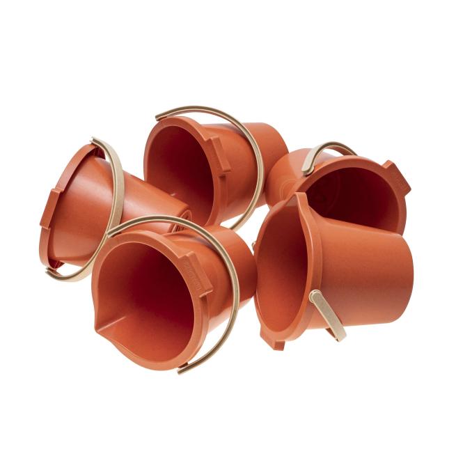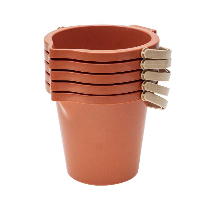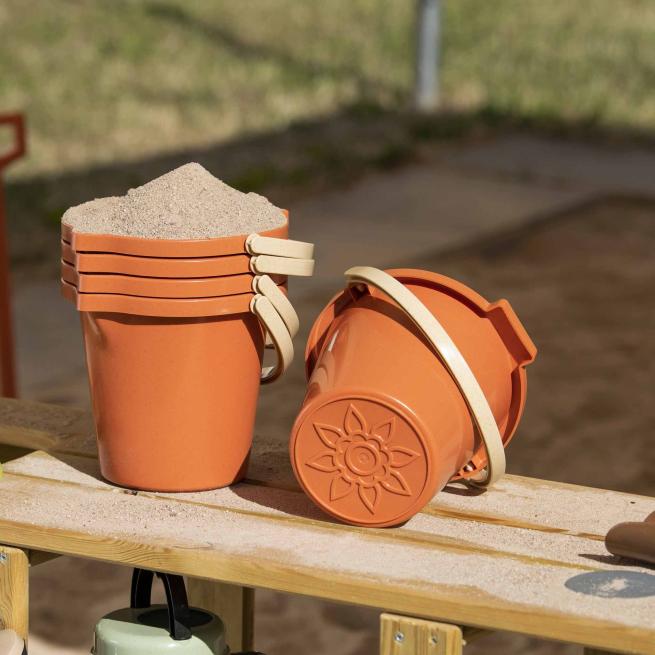 5 Sandspieleimer aus treeNside-Material in den Farben Curry, Türkis, Coral, Braun und GrünNACHHALTIG: Das treeNside-Material